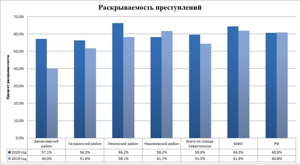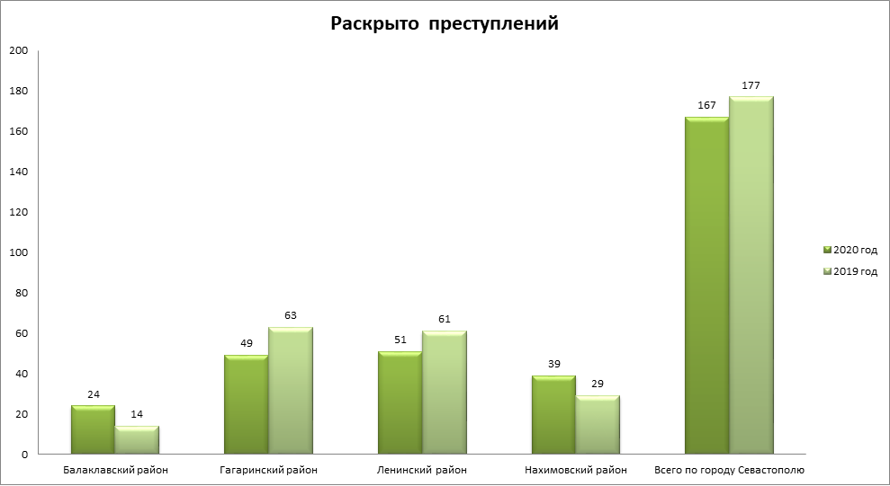Предварительно расследовано (раскрыто) 167 преступлений (в том числе направлено в суд с обвинительным актом, обвинительным постановлением 129 (77,2%)), за аналогичный период 2019 года было раскрыто 177 преступлений (в том числе направлено в суд с обвинительным актом, обвинительным постановлением 141 (79,7%)). Число раскрытых преступлений уменьшилось на 10 единиц, или 5,7%. Снижение количества раскрытых преступлений зарегистрировано в Гагаринском районе на 14 единиц (22,2%) и в Ленинском районе на 10 единиц (16,4%). В Балаклавском районе рост количества раскрытых преступлений составил 10 единиц (71,4%), в Нахимовском районе рост также 10 единиц (34,5%). (Приложение 2)