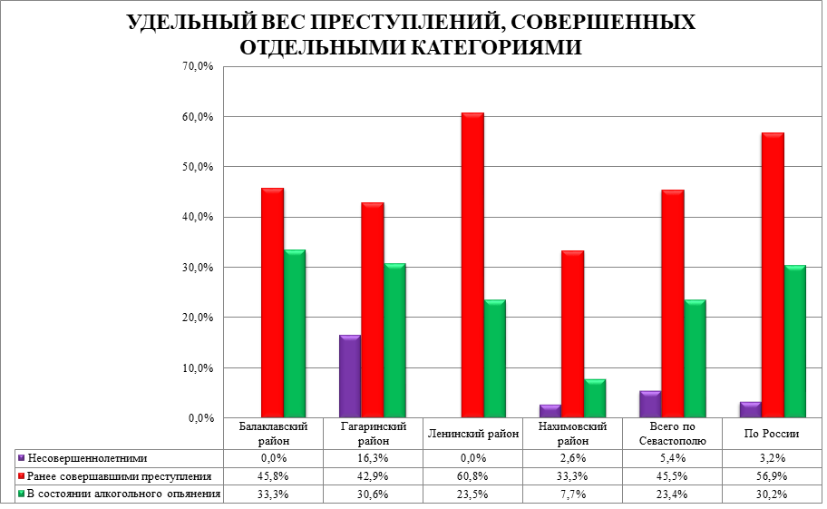 Рост количества зарегистрированных преступлений произошел во всех районах города: в Гагаринском районе на 31 преступление (47,0%), в Балаклавском районе на 12 преступлений (32,4%), в Нахимовском районе на 18 преступлений (31,6%), в Ленинском районе на 21 преступление (29,6%). (Приложение 1)