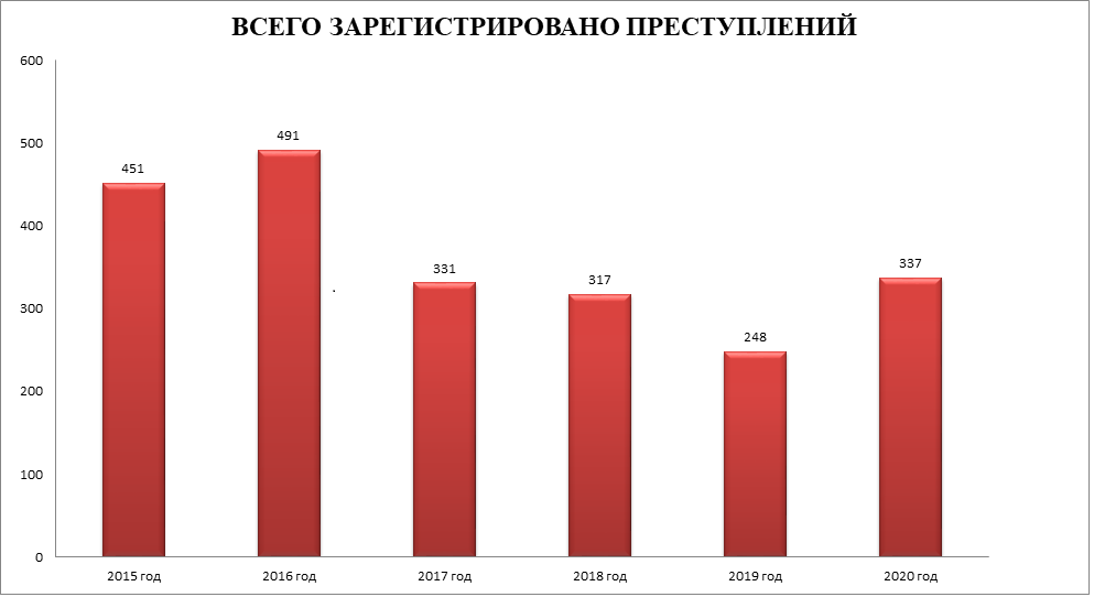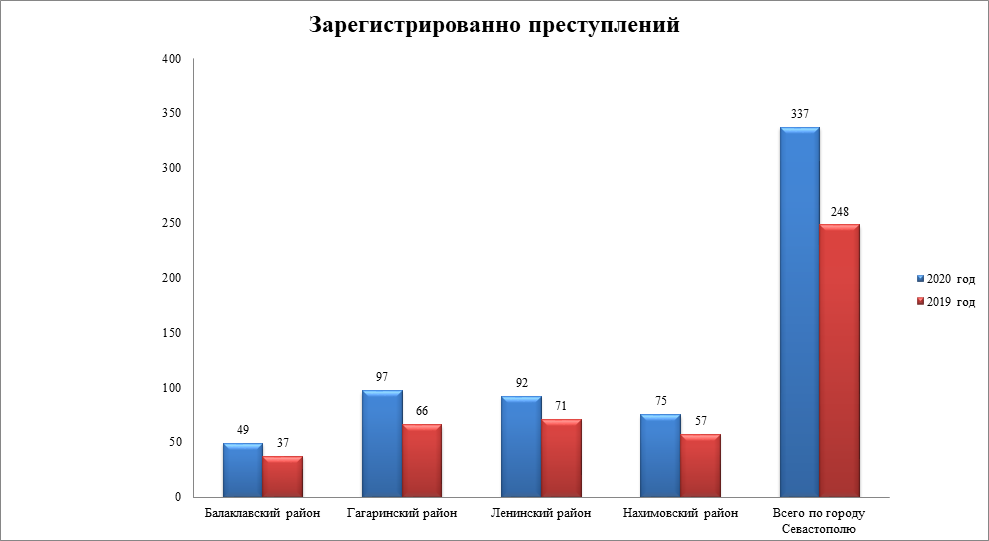 В 2020 году, по данным ИЦ Управления МВД Российской Федерации по городу Севастополю, всего находились в производстве уголовные дела по 1 342 преступлениям, зарегистрировано 337 преступлений. За аналогичный период 2019 года было зарегистрировано 248 преступления. Общее количество преступлений возросло на 89 единиц, или на 35,9%.