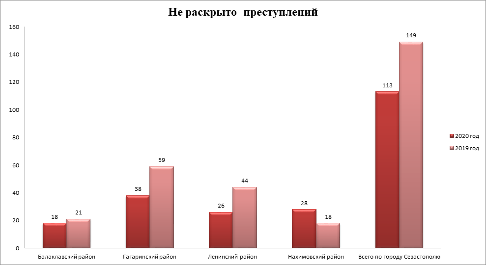 За аналогичный период 2019 года было не раскрыто 149 преступлений (снижение на 36 единиц, или 24,2%). Количество нераскрытых преступлений снизилось в Ленинском районе на 18 единиц (40,9%), в Гагаринском районе на 21 единицу (35,6%) и в Балаклавском районе на 3 единицы (14,3%). В Нахимовском районе рост количества нераскрытых преступлений на 10 единиц (55,6%). (Приложение 3)