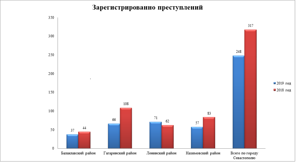 В 2019 году, по данным ИЦ Управления МВД Российской Федерации по городу Севастополю, всего находились в производстве уголовные дела по 1 073 преступлениям, зарегистрировано 248 преступлений. За 1 месяц 2018 года было зарегистрировано 317 преступлений. Общее количество преступлений снизилось на 69 единиц, или на 21,8%.