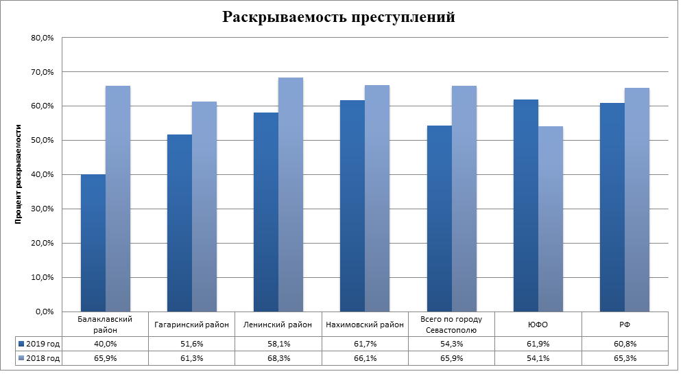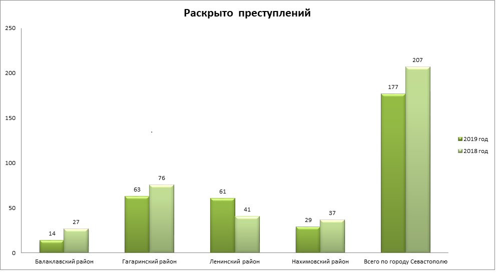 Предварительно расследовано (раскрыто) 177 преступлений (в том числе направлено в суд с обвинительным актом, обвинительным постановлением 141 (79,7%)), за аналогичный период 2018 года было раскрыто 207 преступлений (в том числе направлено в суд с обвинительным актом, обвинительным постановлением 193 (93,2%)). При этом количество преступлений, уголовные дела по которым прекращены, либо вынесено постановление об отказе в возбуждении уголовного дела по реабилитирующим основанием увеличилось с 6 до 34 (+466,7%). В том числе количество вынесенных постановлений об отказе в возбуждении уголовного дела на 600% (с 1 до 7), по п.3 ч.1 ст.24 УПК (лицо, совершившее преступление установлено) с 0 до 6. Количество раскрытых преступлений уменьшилось на 30 единиц, или 14,5%. Рост количества раскрытых преступлений зарегистрирован в Ленинском районе на 20 единиц (48,8%). В Балаклавском районе количество раскрытых преступлений уменьшилось на 13 единиц (48,2%), в Нахимовском районе на 8 единиц (21,6%), в Гагаринском на 13 единиц (17,1%). (Приложение 2)