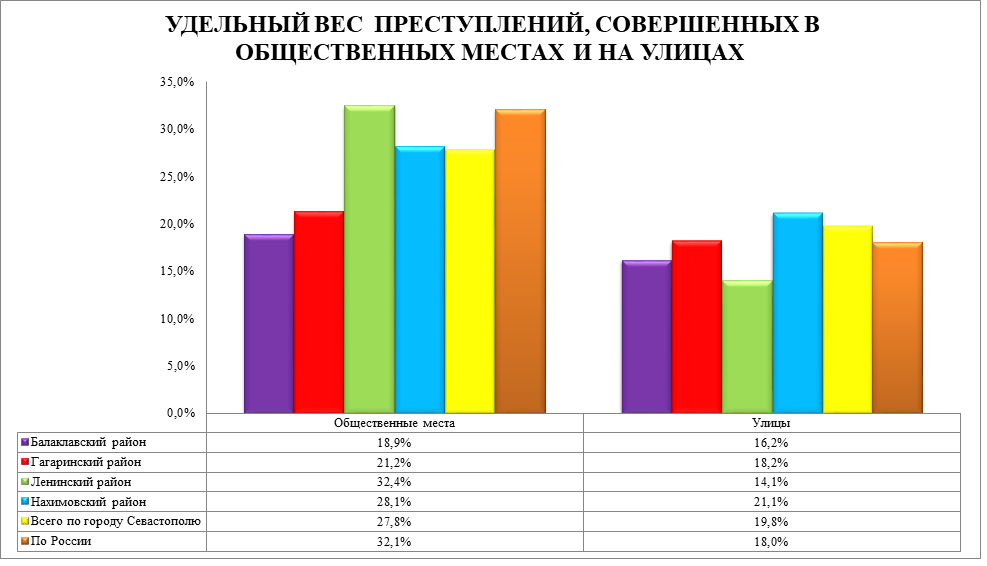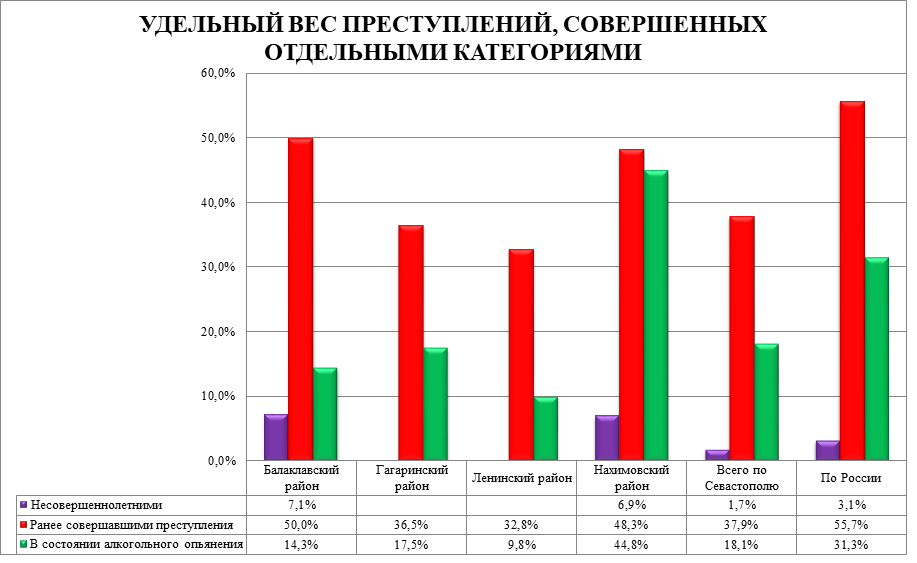 Количество преступлений особо тяжкой и тяжкой категорий снизилось на 52 единицы, или 47,3%, в том числе в Гагаринском районе на 24 единицы (58,5%), в Нахимовском районе на 10 единиц (50,0%), в Балаклавском районе на 6 единиц (35,3%), в Ленинском районе на 2 единицы (11,1%).