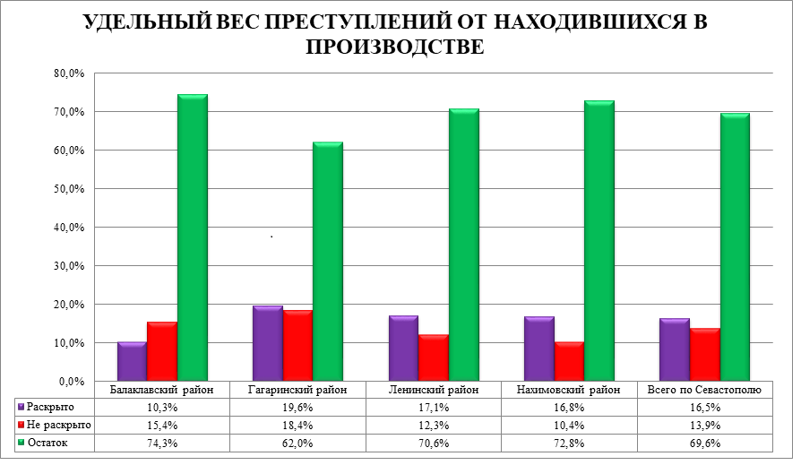 Процент раскрываемости преступлений составил 54,3% (раскрыто 177, не раскрыто 149 преступлений). По итогам работы за 1 месяц 2018 года раскрываемость составляла 65,9% (раскрыто 207, не раскрыто 107 преступлений). Раскрываемость снизилась в Нахимовском районе с 66,1% до 61,7%, в Ленинском районе с 68,3% до 58,1%, в Гагаринском районе с 61,3% до 51,6%, в Балаклавском районе с 65,9% до 40,0%. (Приложение 4)