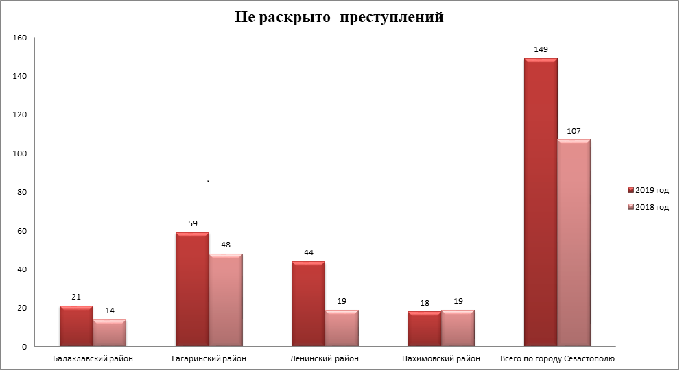 За аналогичный период 2018 года было не раскрыто 107 преступлений (рост составил 42 единицы, или 39,3%). Количество нераскрытых преступлений снизилось в Нахимовском районе на 1 единицу (5,3%). В Ленинском районе количество нераскрытых преступлений возросло на 25 единиц (131,6%), в Балаклавском районе на 7 единиц 950,0%), в Гагаринском районе на 11 единиц (22,9%). (Приложение 3)