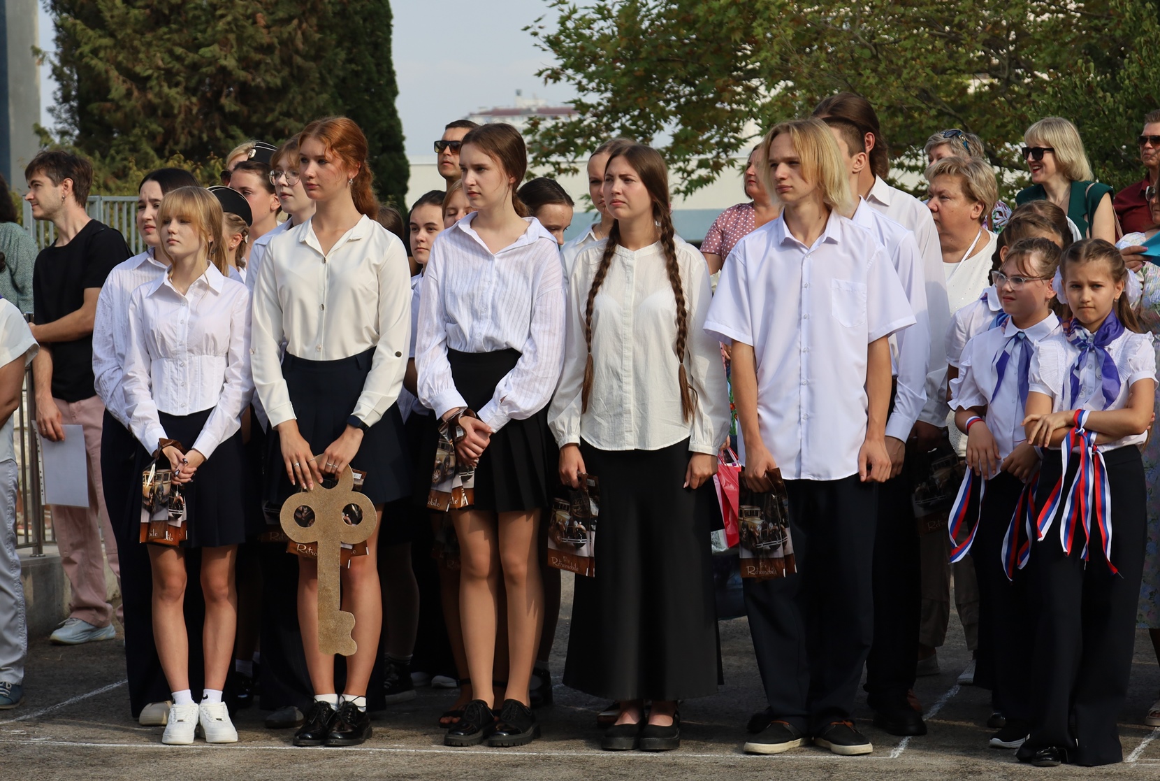 На торжественном мероприятии собрались учащиеся 1, 5, 9 и 11 классов, их родители и педагоги.