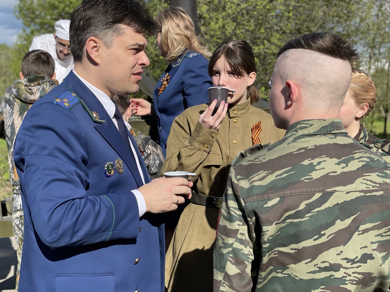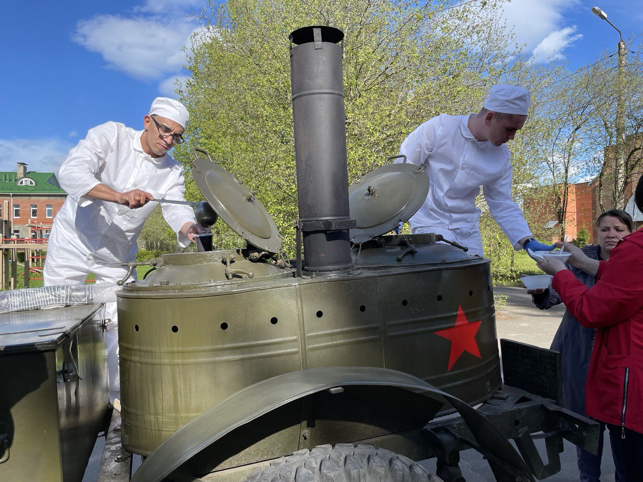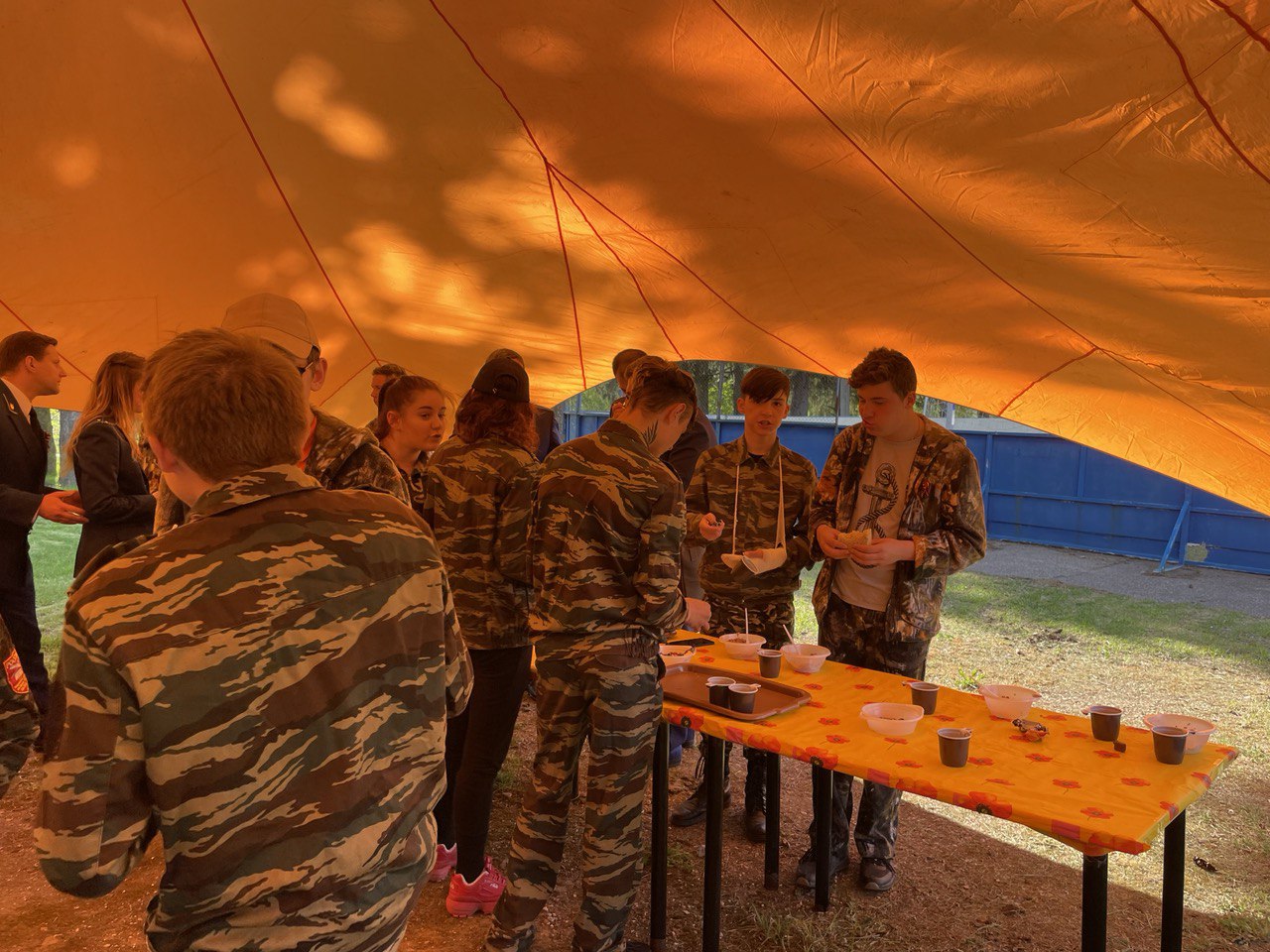 На свежем воздухе была развернута полевая кухня, где дети с удовольствием попробовали солдатскую кашу и горячий чай.