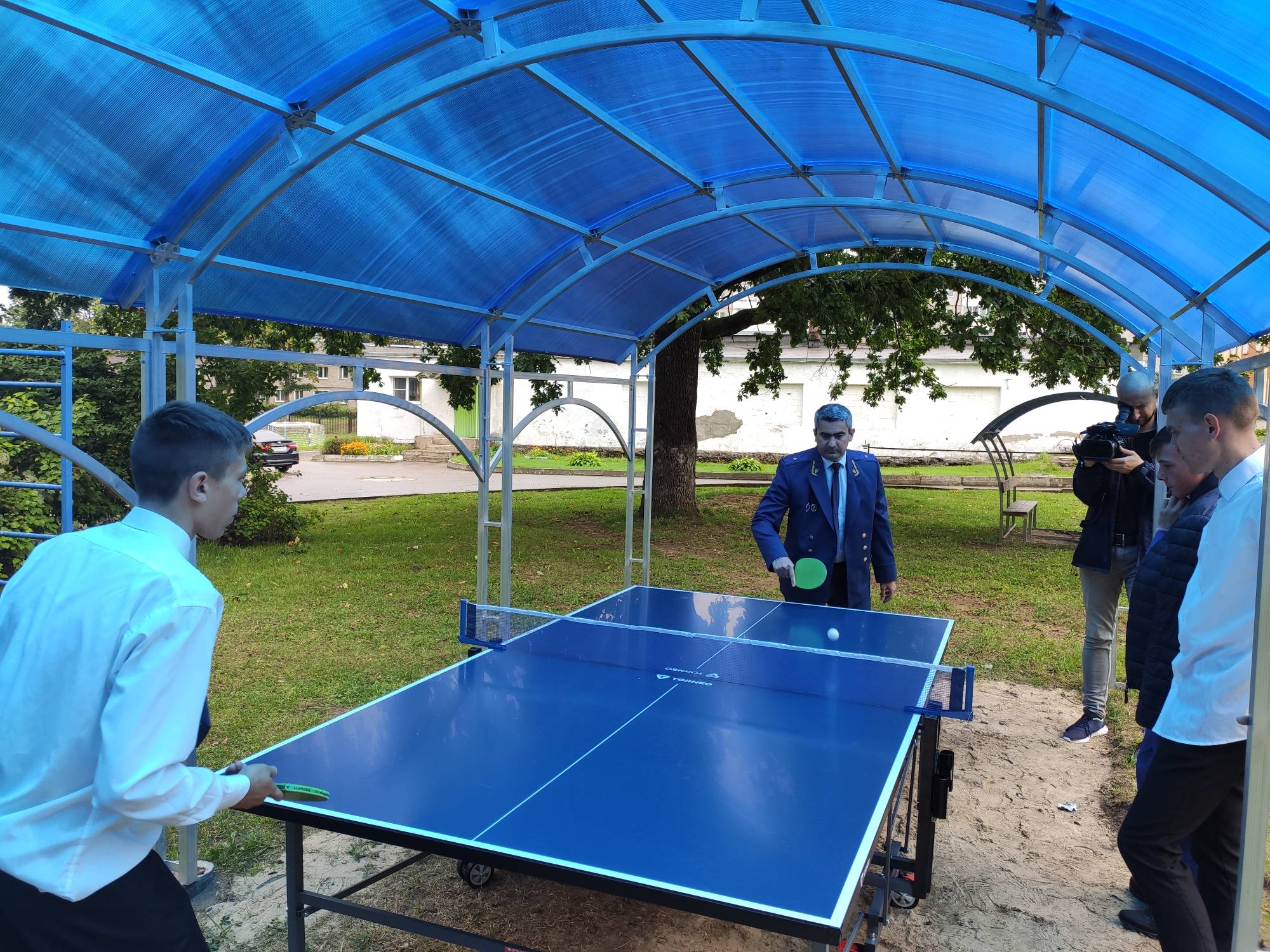 После чего, прокурор области осмотрел подаренный образовательному учреждению крытый павильон для настольного тенниса, в неформальной обстановке пообщался с учителем физкультуры и провел дружеский матч с воспитанником школы-интерната.
