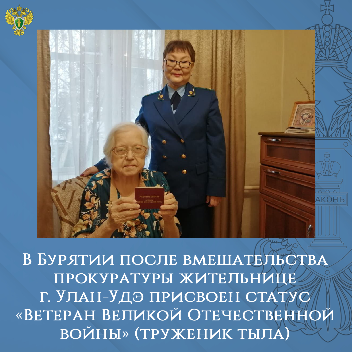 Прокуратура Республики Бурятия провела проверку по вопросу получения статуса «Ветеран Великой Отечественной войны» (труженик тыла) престарелой женщиной.