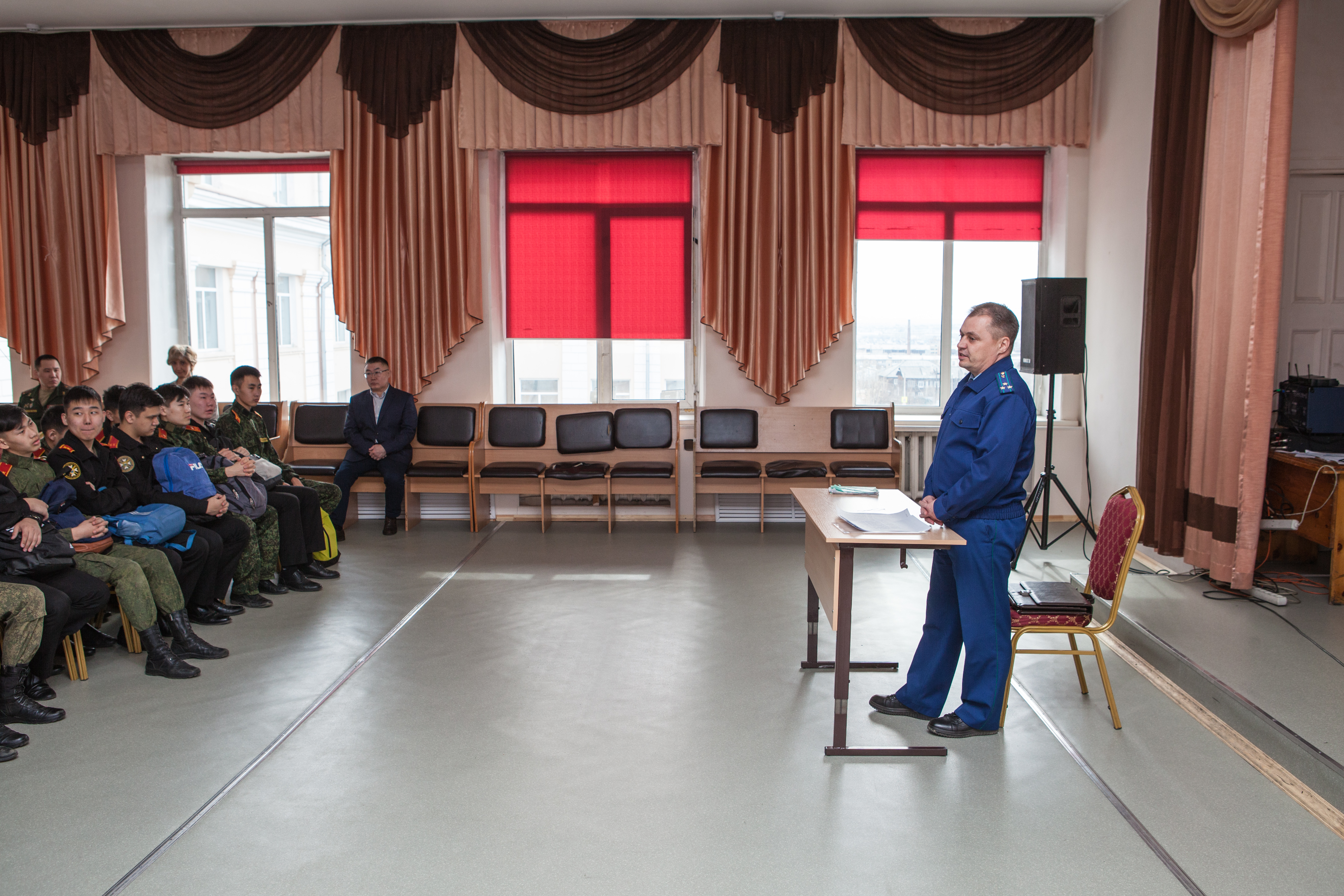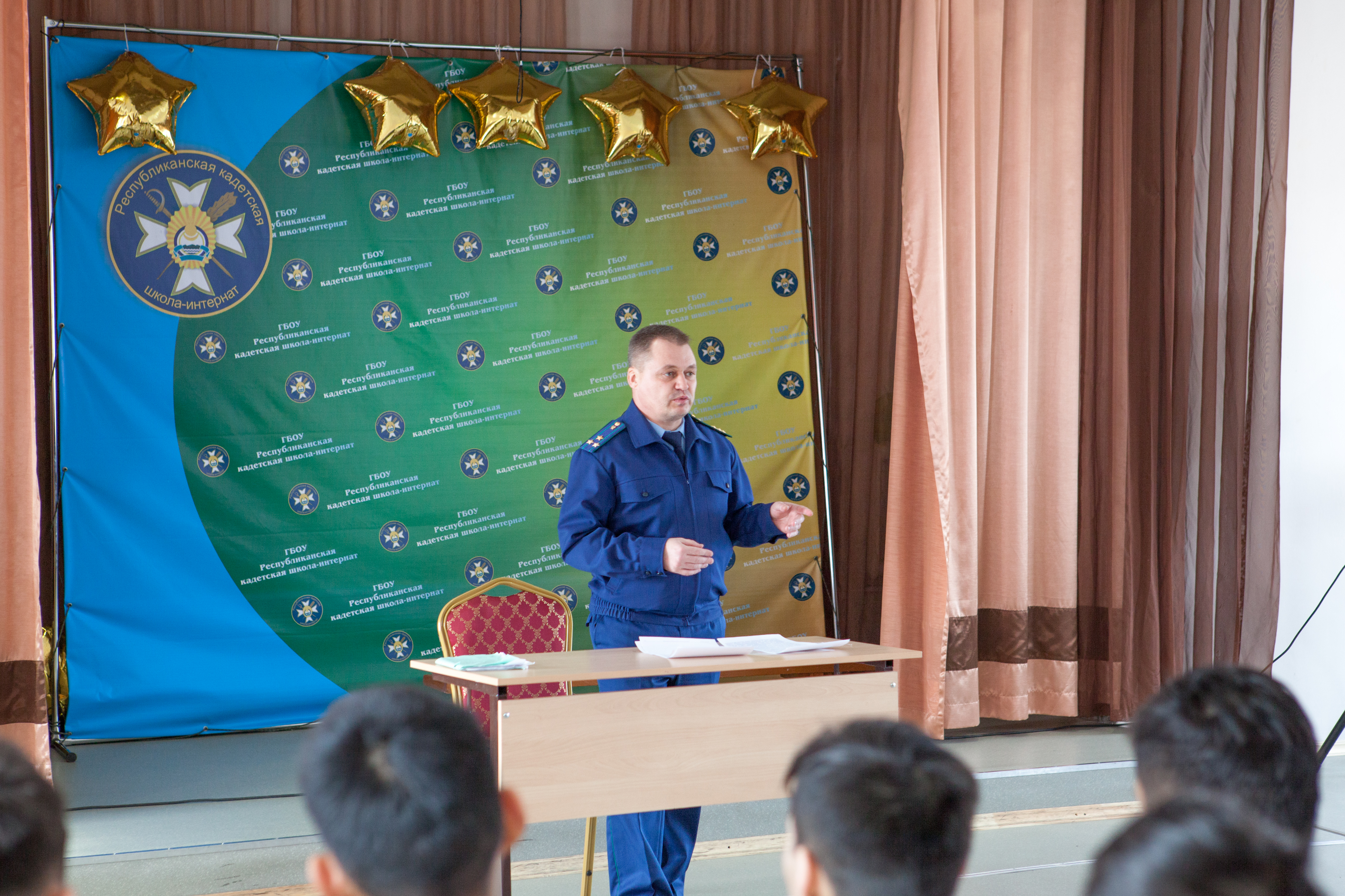 Также прокурор рассказал кадетам об особенностях прохождения службы в органах прокуратуры, о системе прокуратуры Российской Федерации, разъяснил полномочия военных прокуроров. Учащиеся узнали об условиях и порядке отбора кандидатов в абитуриенты, зачисления в высшие учебные заведения по целевому обучению от прокуратуры республики и последующего трудоустройства в органы прокуратуры.