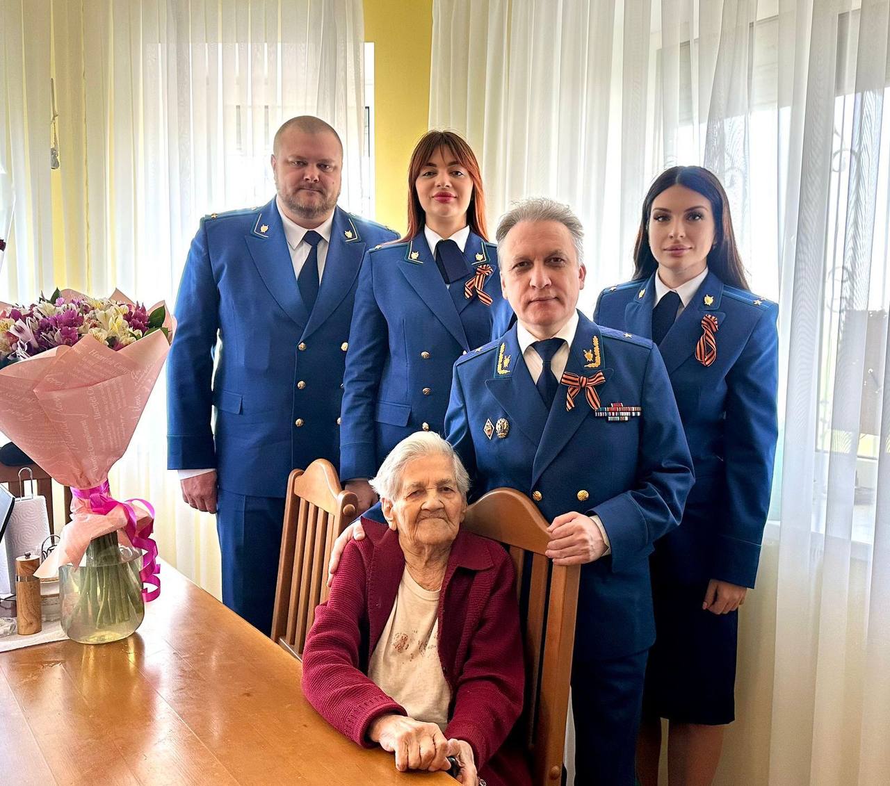 Прокурор республики Глеб Михайлов от коллектива прокуратуры выразил слова искренней благодарности за героизм и отвагу, проявленные при защите Родины от немецко-фашистских захватчиков. Поздравил ветерана с наступающим 100-летним юбилеем и пожелал ей крепкого здоровья, счастья, благополучия и мирного неба над головой.