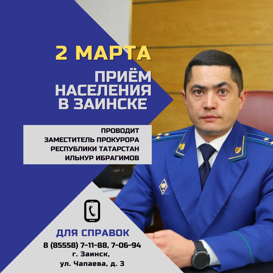 В четверг, 2 марта 2023 года, заместитель прокурора Республики Татарстан Ильнур Ибрагимов проведет приём граждан по вопросам соблюдения федерального законодательства в г. Заинске.