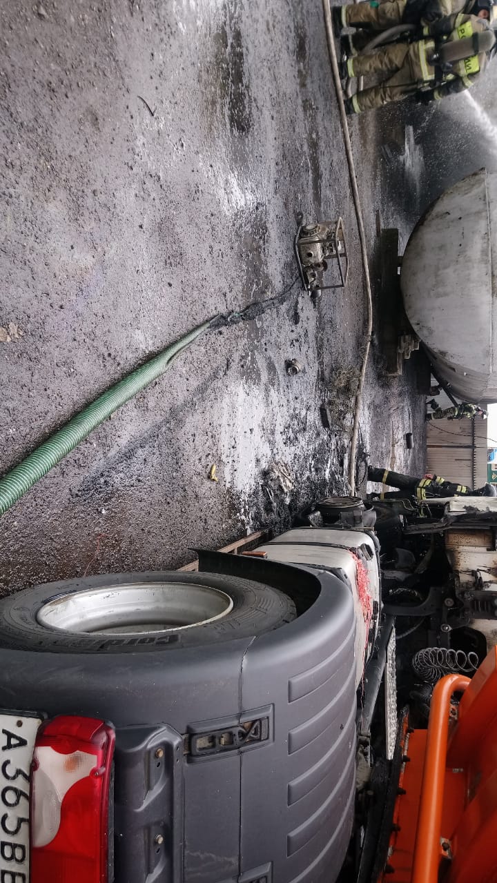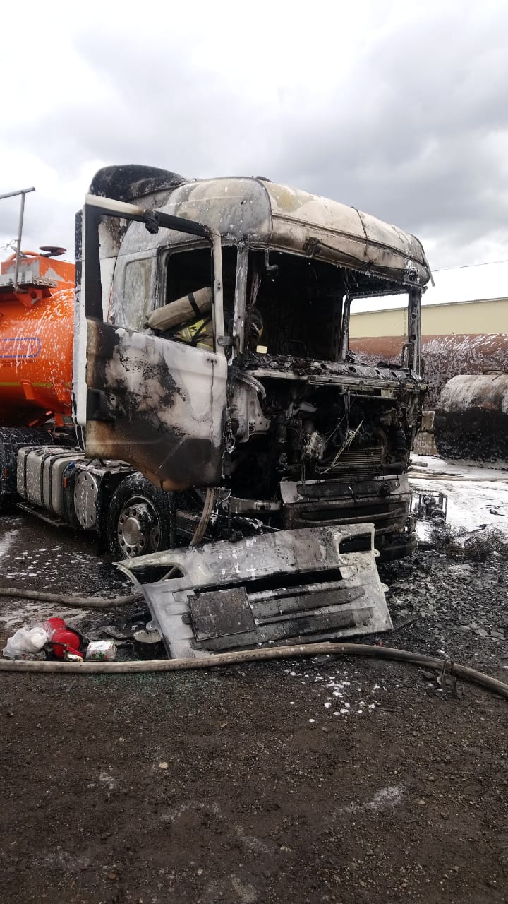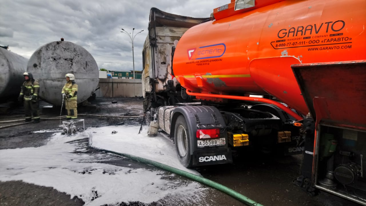 В Набережных Челнах сегодня около 10:30 на Казанском проспекте при переливе из стационарной цистерны в бензовоз произошел разлив и возгорание дизельного топлива. В результате автомобиль загорелся и получил существенные повреждения - полностью выгорела кабина.