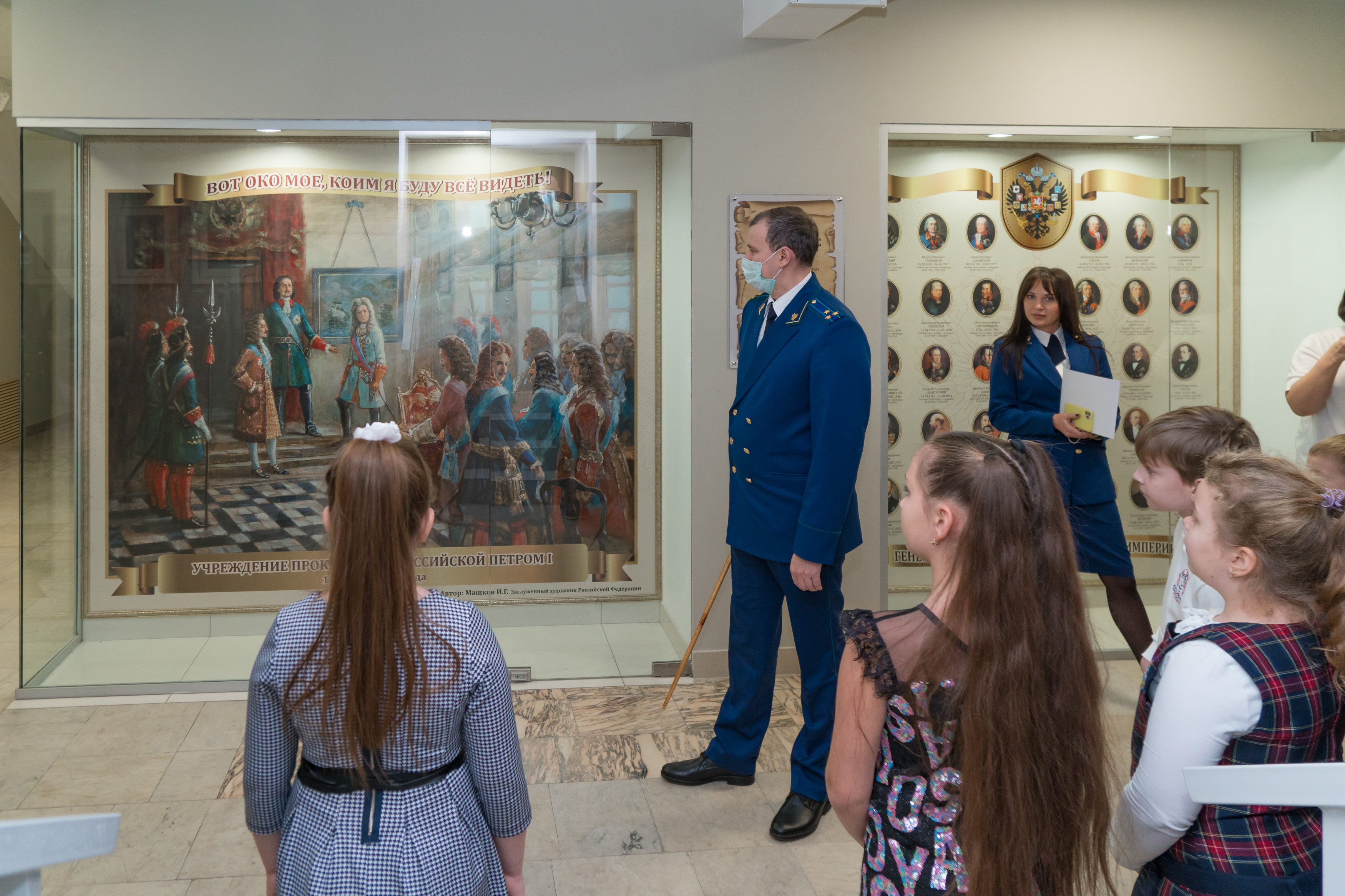 Ребятам рассказали историю создания прокуратуры от самых истоков до настоящего времени, они увидели множество интересных экспонатов, здание, которое занимала прокуратура, удостоверение прокуроров разных лет. Центральное место отведено фотографиям прокуроров, возглавлявших в разные периоды прокуратуру области .