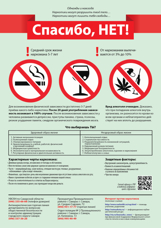 В рамках работы прокуратуры Промышленного района г. Самары по противодействию незаконного оборота наркотических средств и психотропных веществ, в сентябре 2013 года совместно с автономной некоммерческой организацией содействия здоровому образу жизни «Здоровый город» реализована программа профилактики наркомании среди несовершеннолетних «Спасибо, нет!».