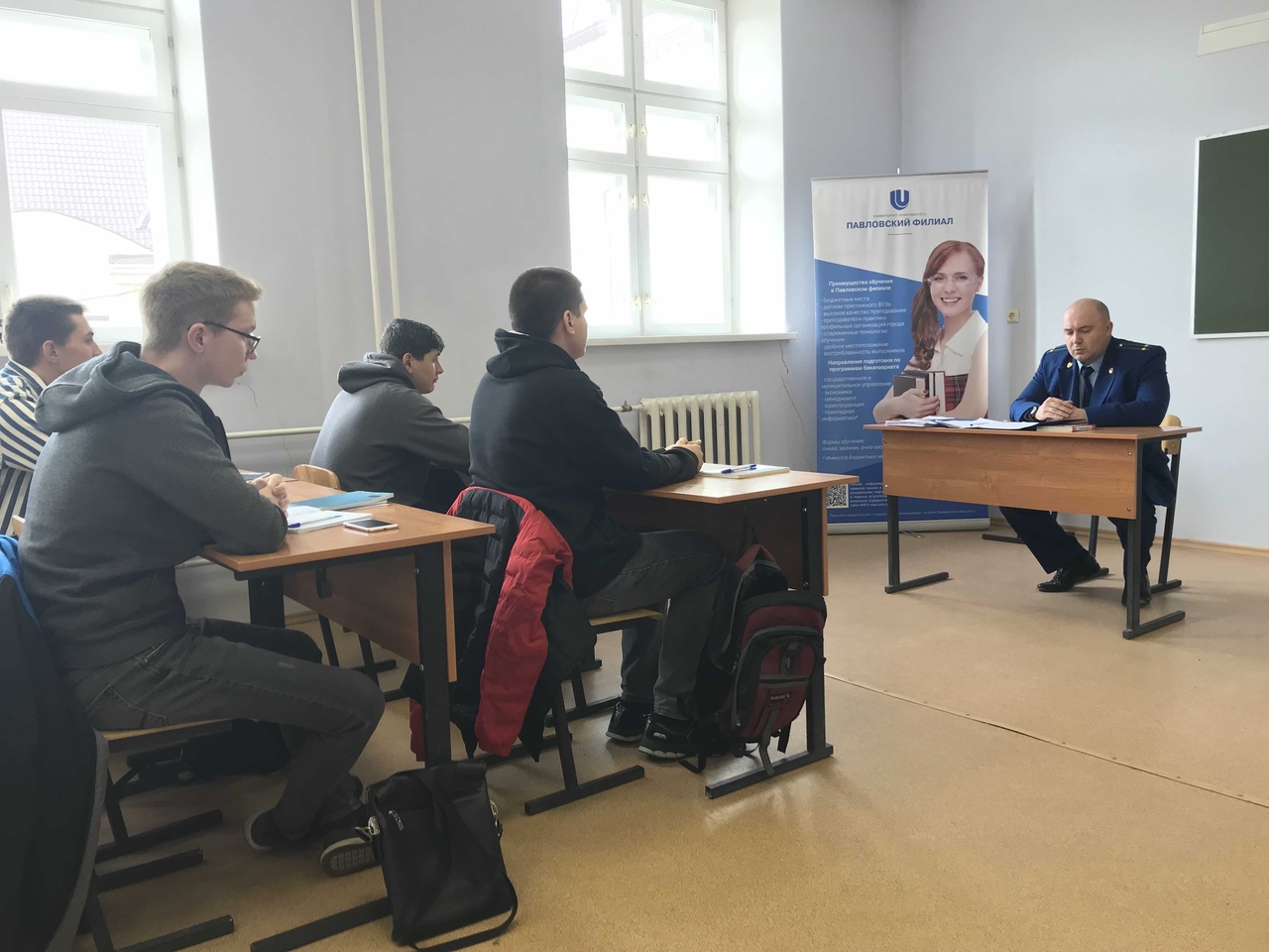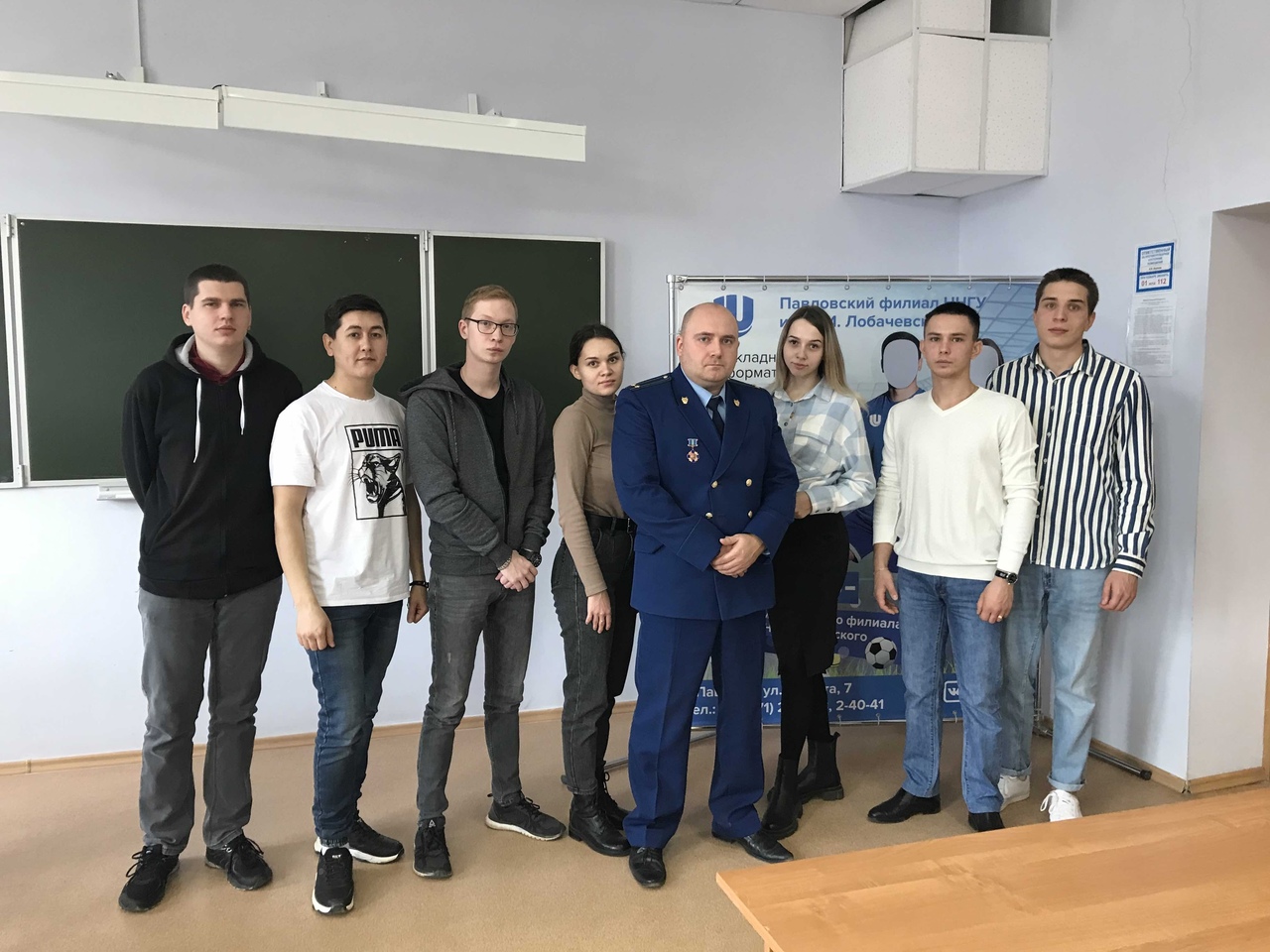Сотрудники Павловской городской прокуратуры провели встречу со студентами старших курсов филиала ННГУ им. Н.И. Лобачевского. Им рассказали о качествах, которыми должен обладать прокурорский работник, и роли прокурора в эффективном обеспечении верховенства закона, защиты прав и свобод граждан и охраняемых законом интересов общества и государства. Внимание молодежи акцентировано на практике осуществления надзорной деятельности, результатах наиболее интересных уголовных дел.