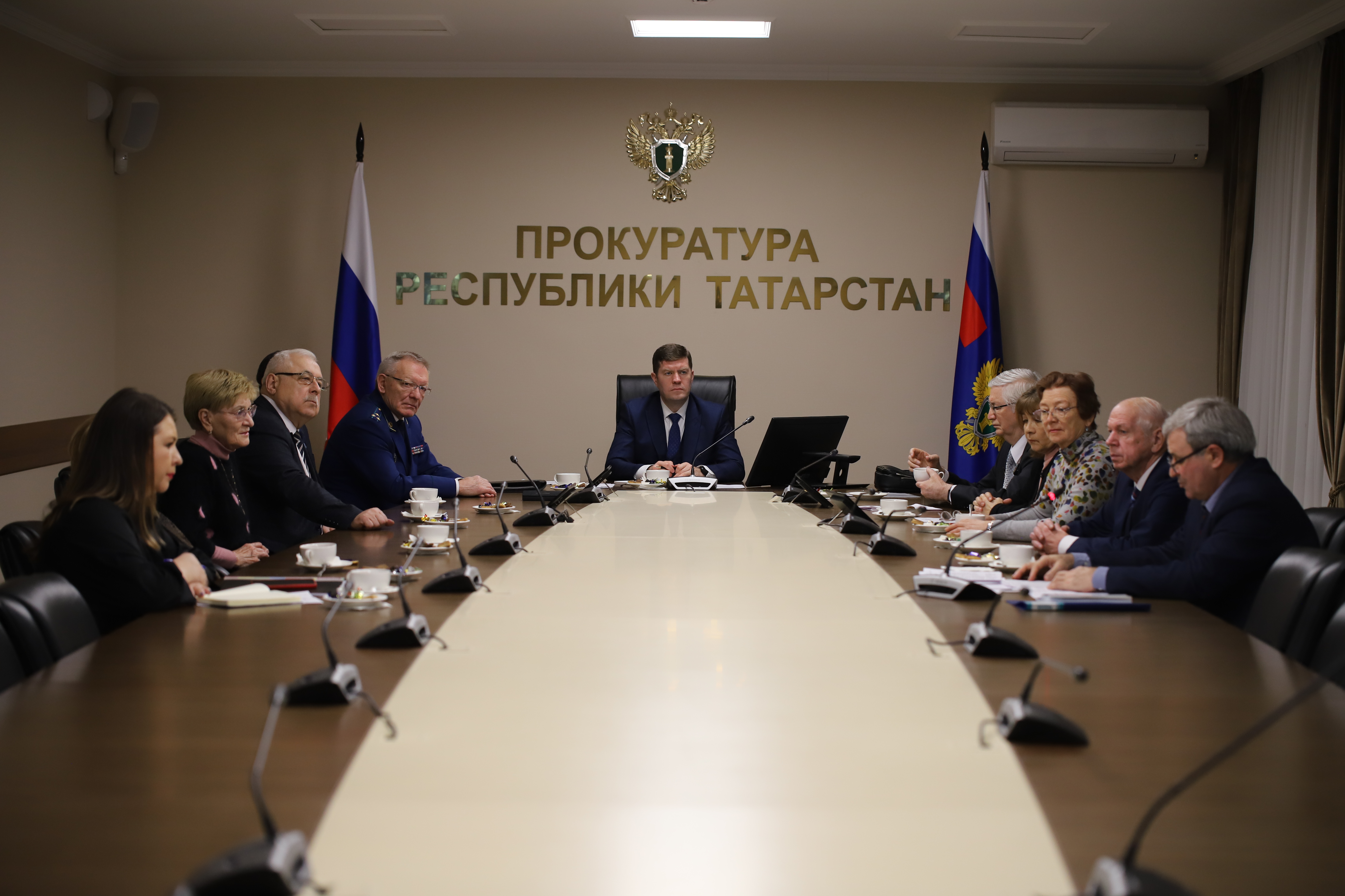 Прокурор Татарстана Альберт Суяргулов встретился сегодня с представителями Совета ветеранов и Совета наставников надзорного ведомства с целью подведения итогов работы организаций за 2023 год и планирования комплекса коллективных (общих) мероприятий по патриотическому воспитанию молодых сотрудников на будущий год.