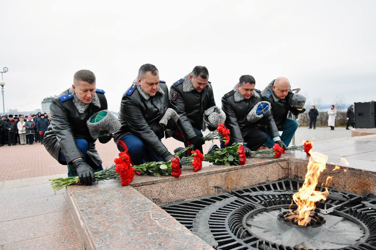 Совместно с руководителями правоохранительных ведомств региона и органов власти республики он возложил цветы к Вечному Огню в Мемориальном комплексе "Победа".