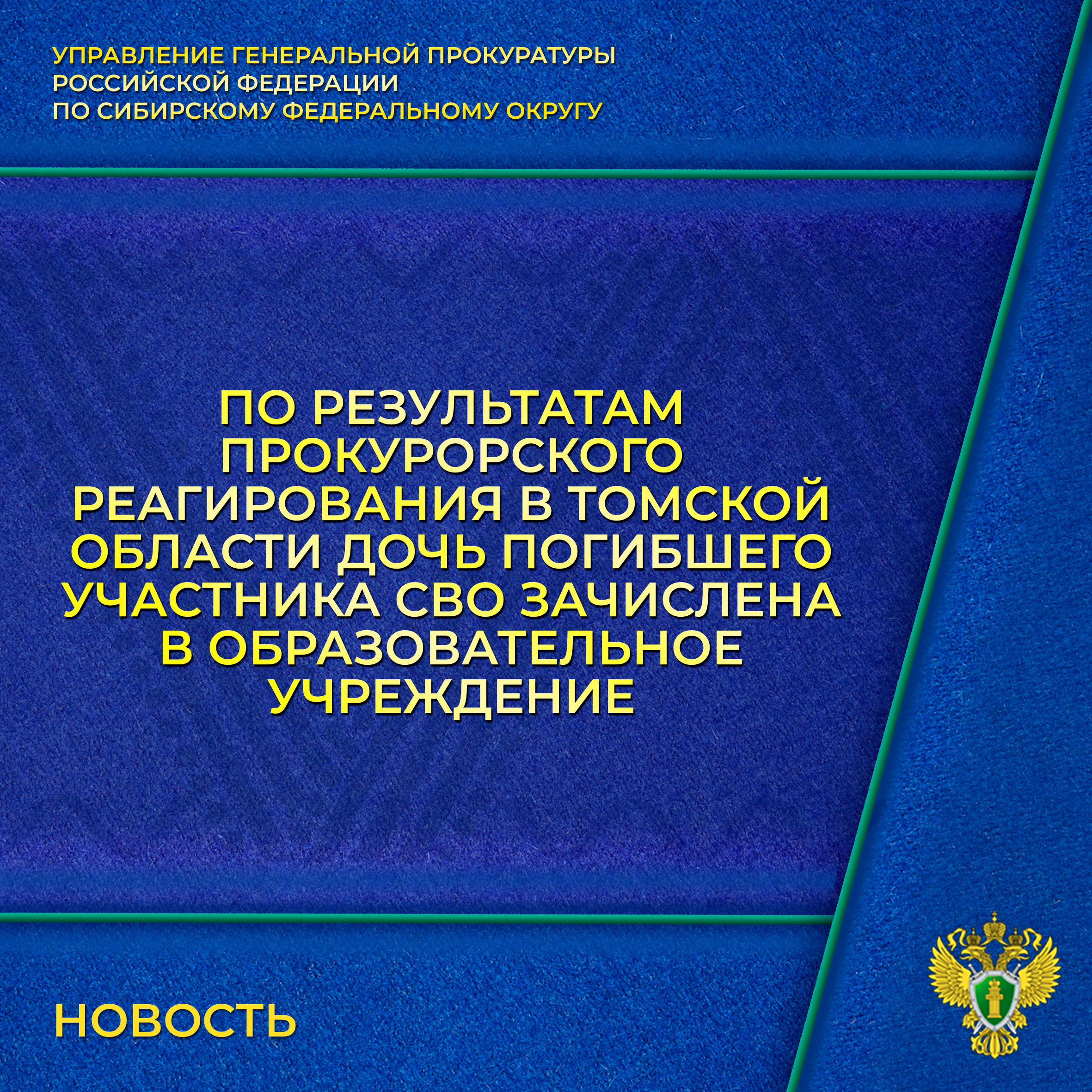 Управлением Генпрокуратуры России по Сибирскому федеральному округу с привлечением прокуратуры Томской области рассмотрено обращение дочери погибшего участника специальной военной операции об отказе в приеме в образовательное учреждение.