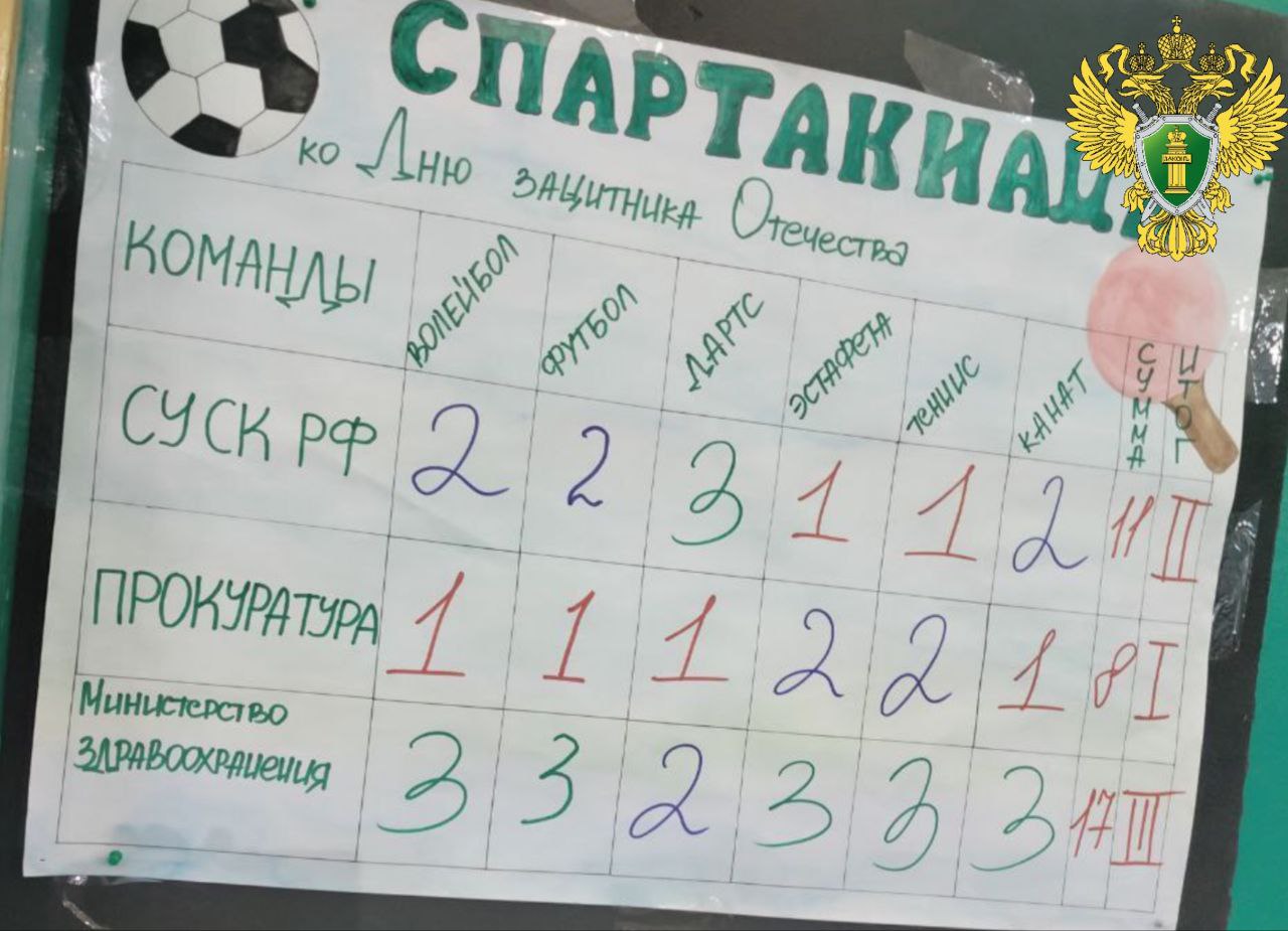 В соревнованиях приняли участие команды, представляющие региональные прокуратуру, министерство здравоохранения и следственный комитет.Участники продемонстрировали свои навыки в различных видах спорта: волейболе, мини-футболе, дартсе, настольном теннисе, эстафете и перетягивании каната.