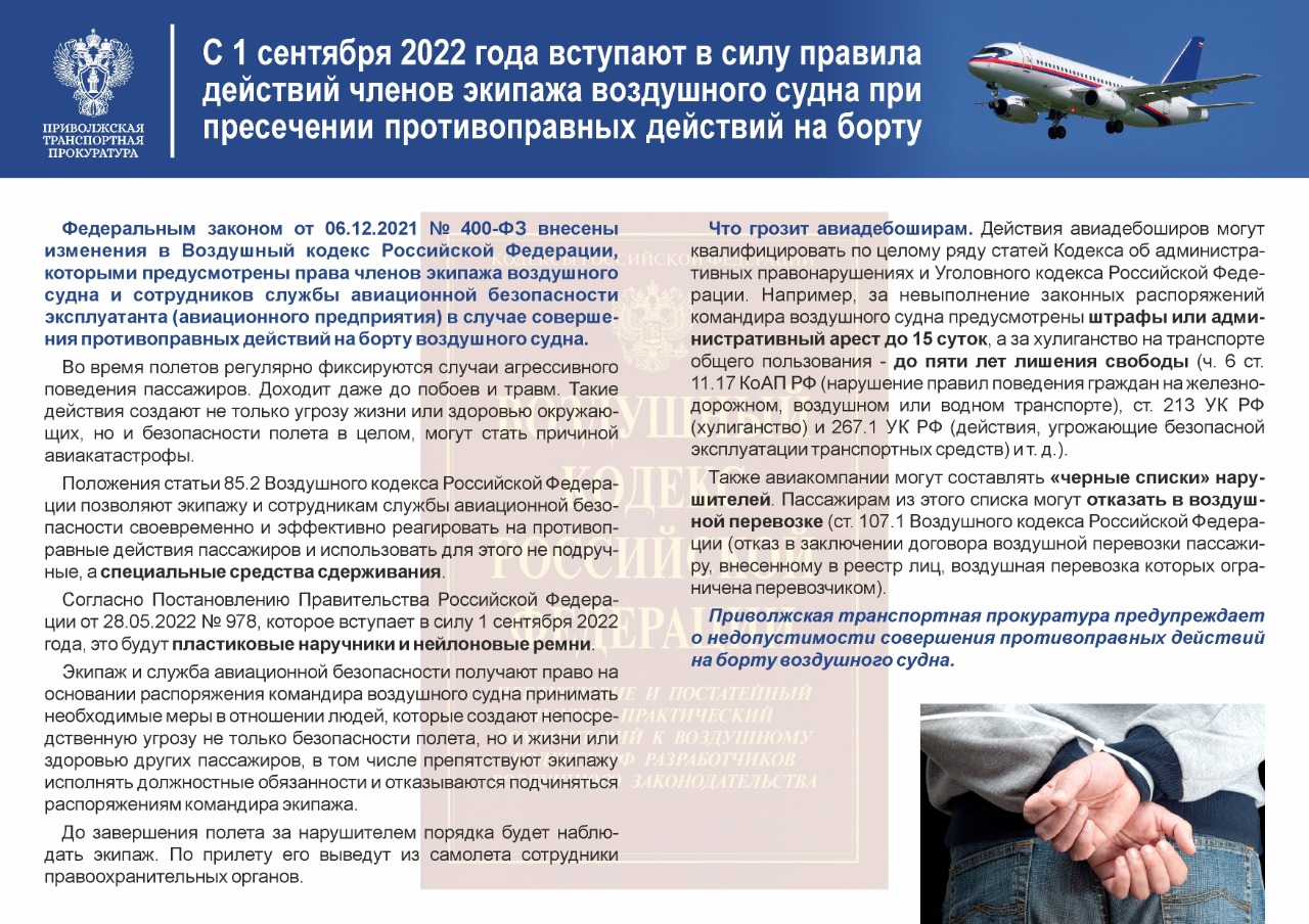 Федеральным законом от 06.12.2021 № 400-ФЗ внесены изменения в Воздушный кодекс Российской Федерации, которыми предусмотрены права членов экипажа воздушного судна и сотрудников службы авиационной безопасности эксплуатанта (авиационного предприятия) в случае совершения противоправных действий на борту воздушного судна.