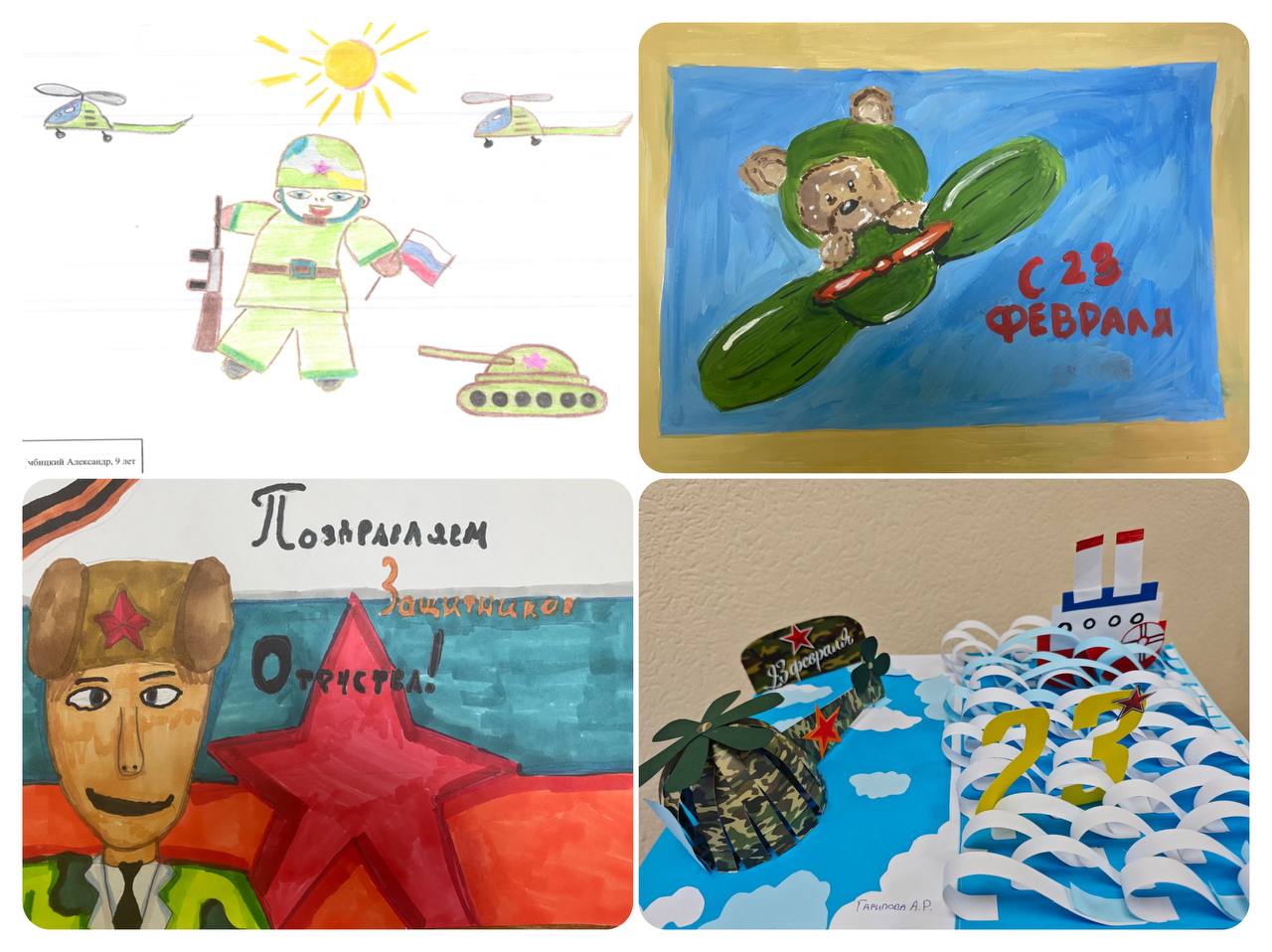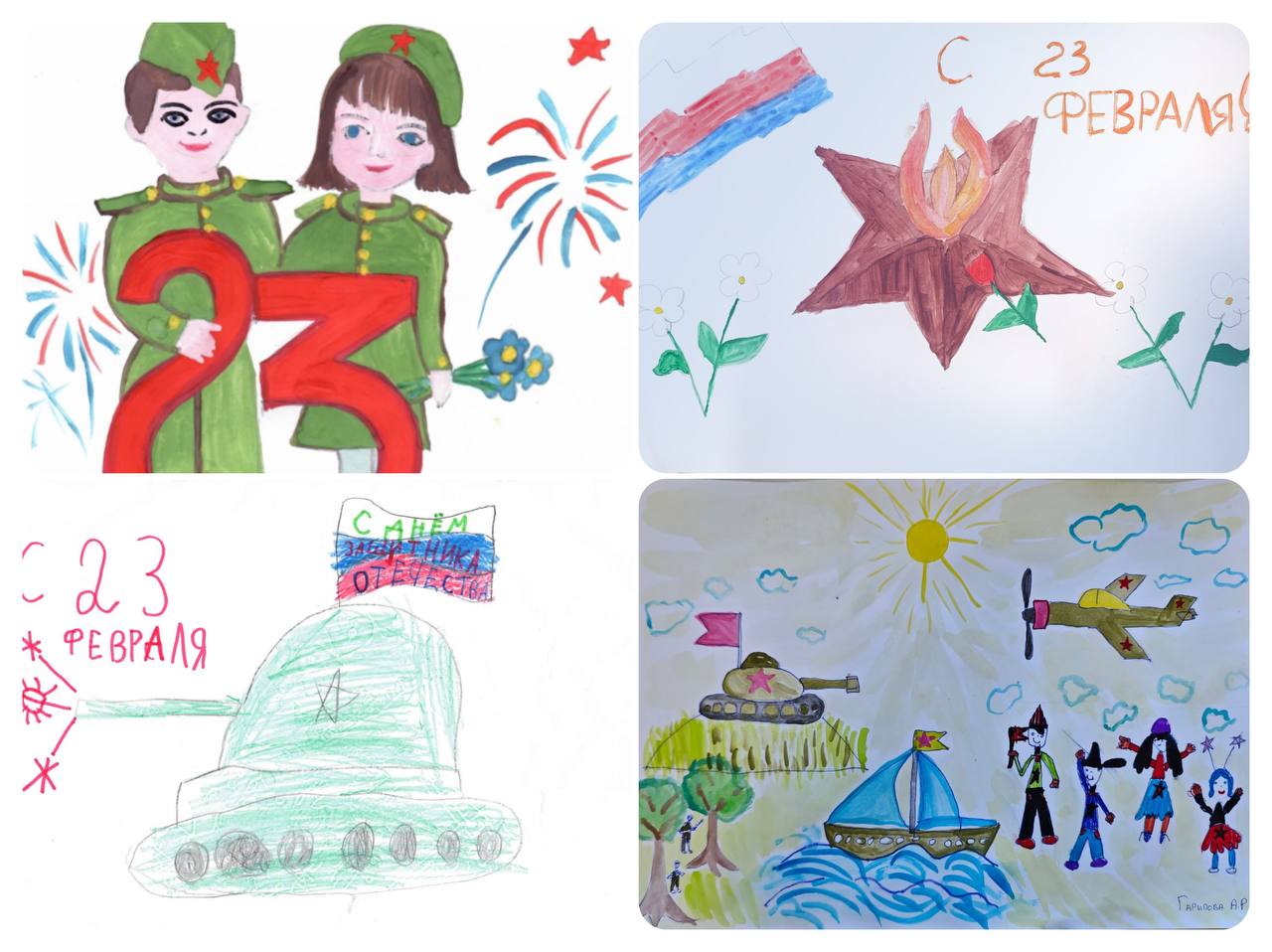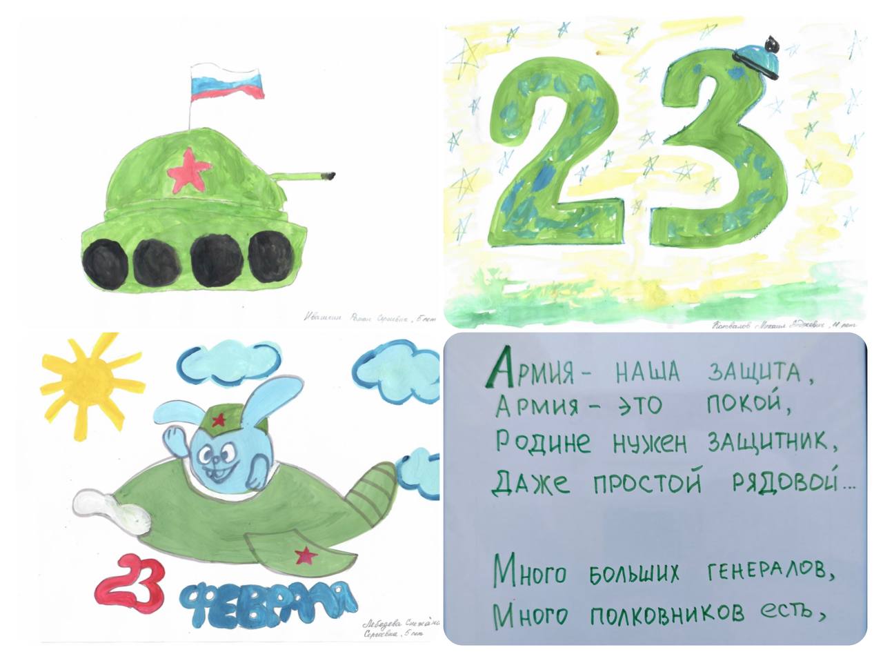 На конкурс представлены поделки, рисунки, стихи, кроссворды и видеоролики с поздравлениями. Участники конкурса поделились частичкой своего творчества, проявив активность, оригинальность замысла и творческий подход в создании конкурсных работ. Яркие рисунки и поделки танков и храбрых солдат, видеопоздравления родных – пап, дедушек и братьев, а также всех защитников Отечества, которые в эти дни находятся на передовой в зоне специальной военной операции.