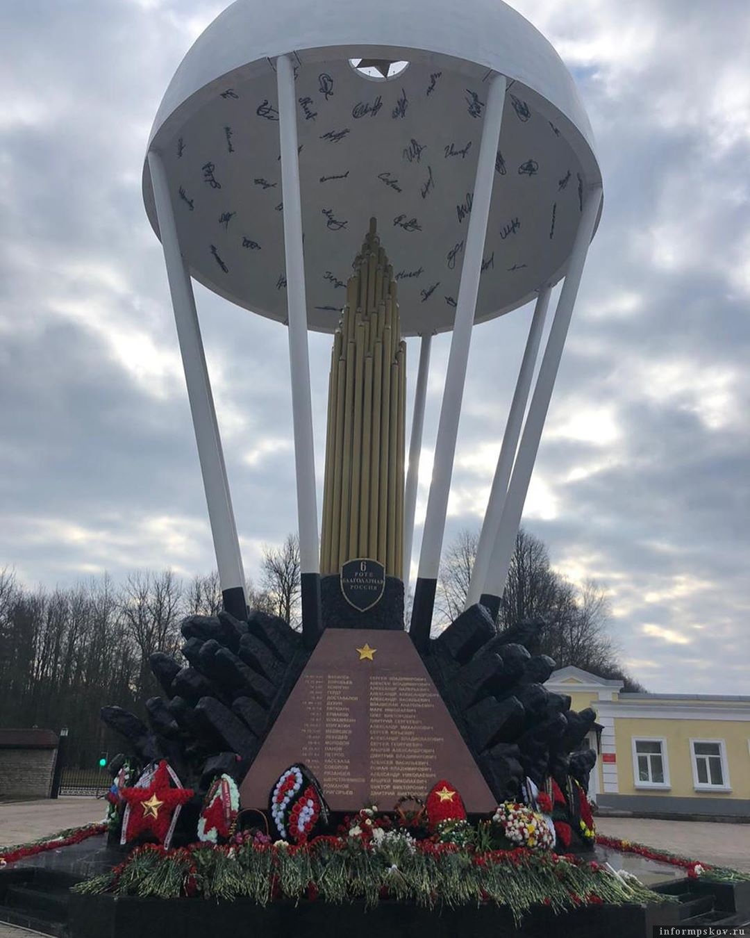 Имена погибших выбиты на гранитном основании монумента «Купол» в деревне Череха Псковской области. Постамент стилизован под горную вершину. Стальными стропами на постамент опирается металлический купол парашюта.