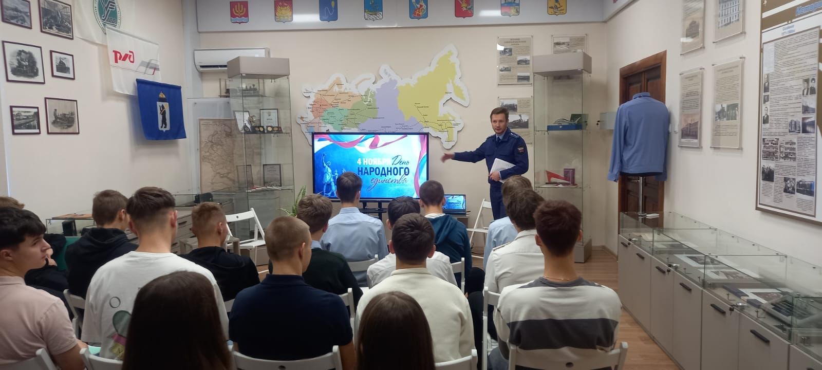 Помощник Ярославского транспортного прокурора Максим Юрчук в преддверии празднования Дня народного единства провёл встречу со студентами Ярославского филиала Петербургского государственного университета путей сообщения Императора Александра I.