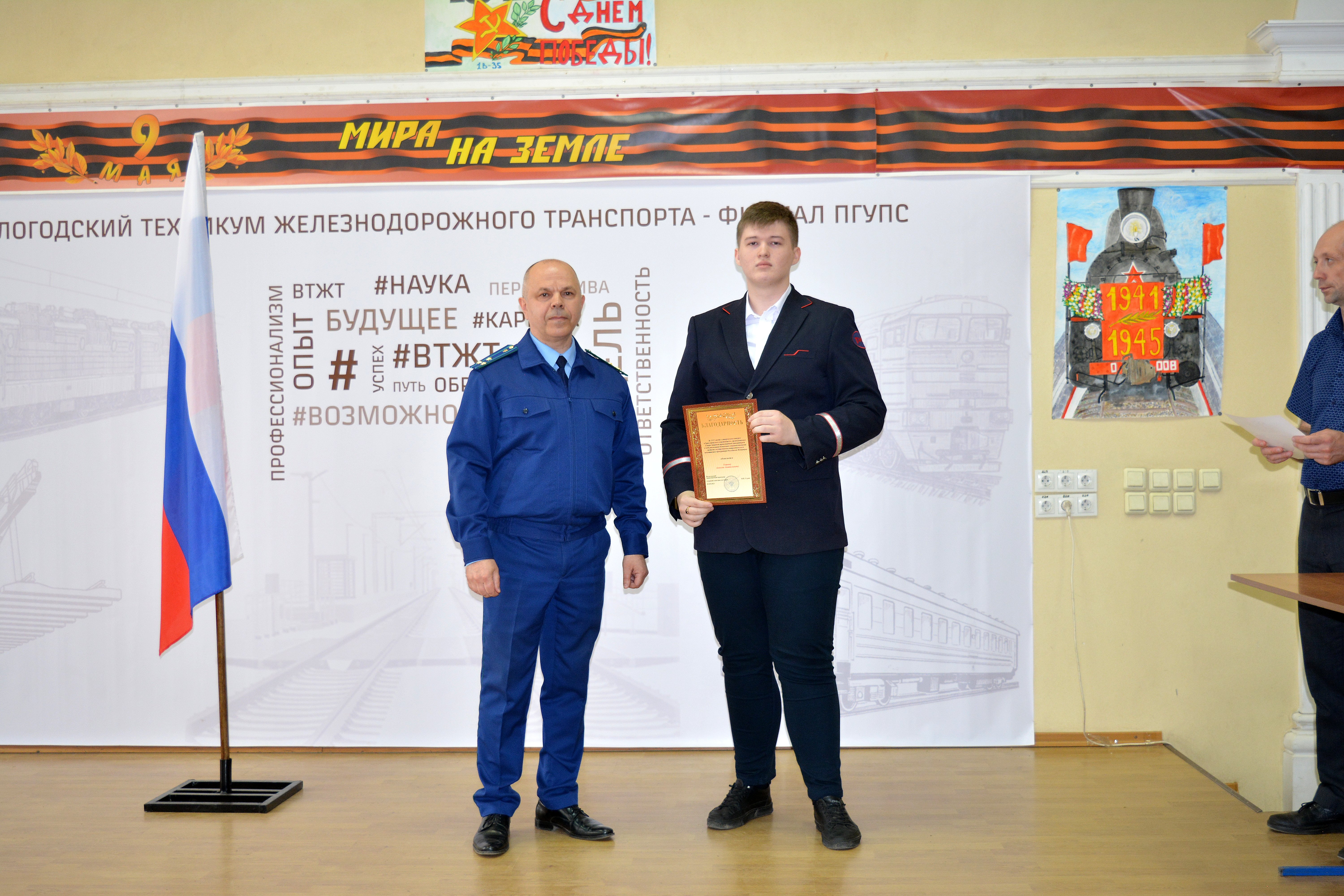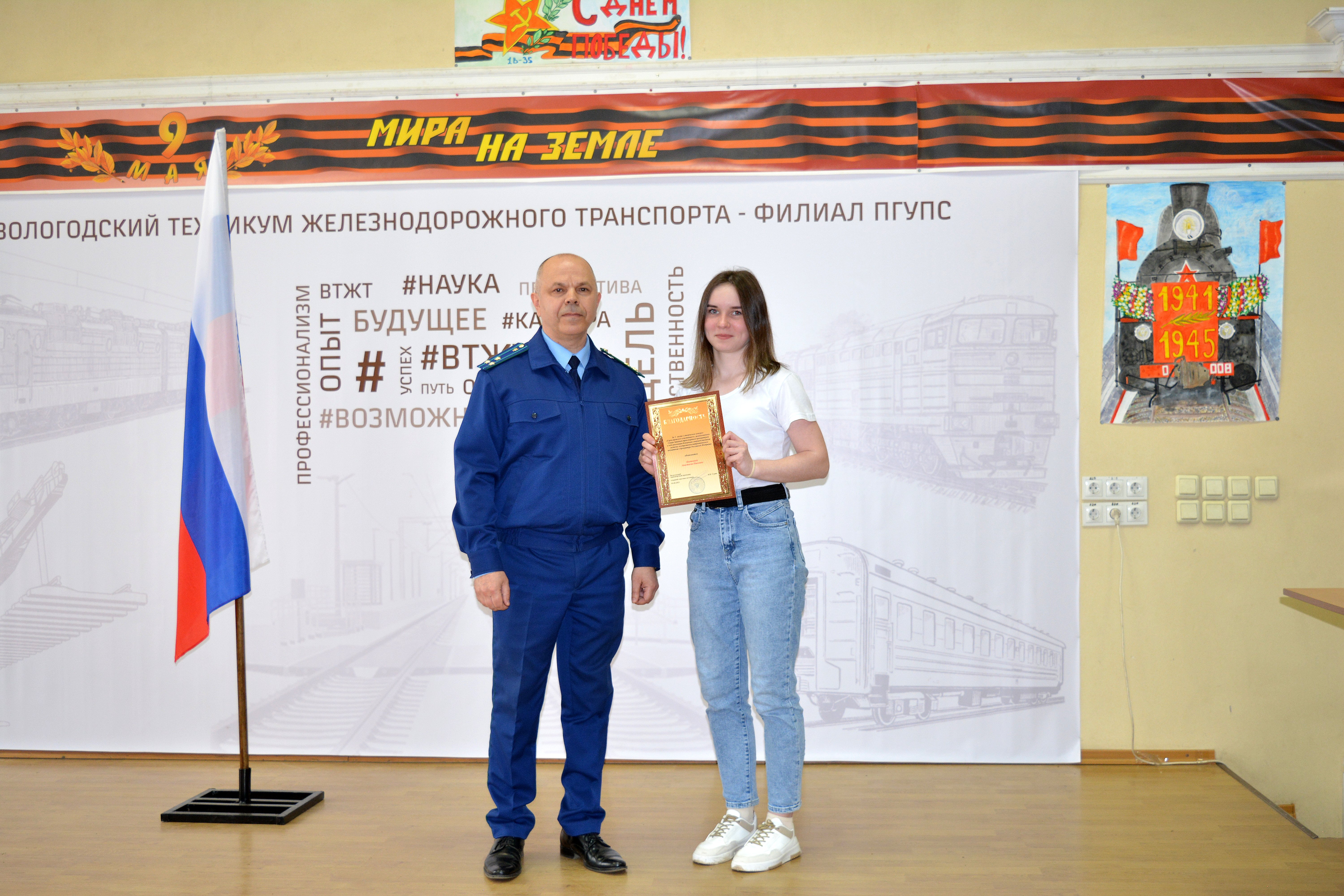 За активное участие в творческом конкурсе «Герои прошлого и настоящего» (организатор - Северо-Западная транспортная прокуратура) он вручил студентам благодарственные письма.
