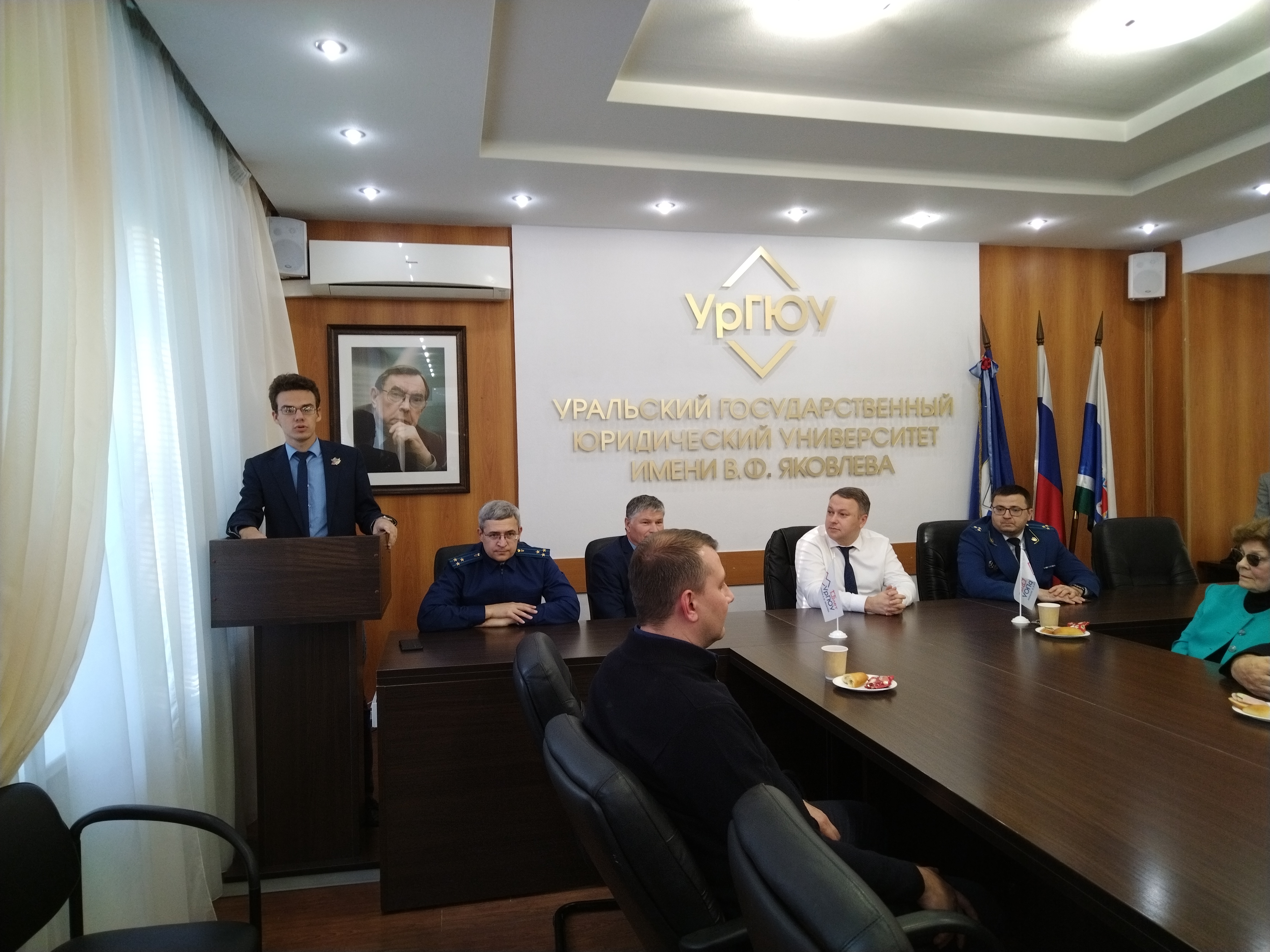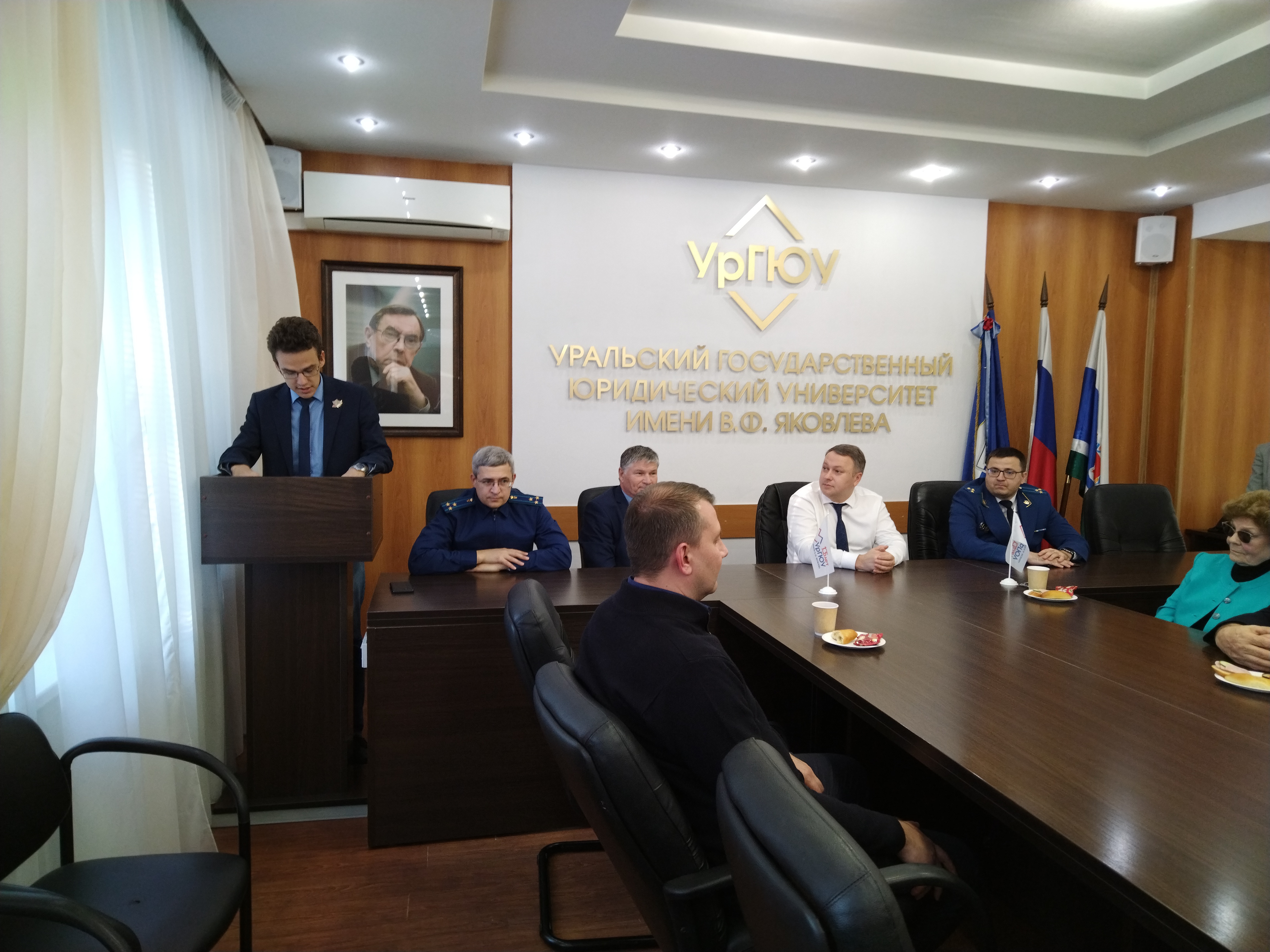 Состоялась встреча коллектива молодых сотрудников Уральской транспортной прокуратуры, студентов, обучающихся по целевым направлениям, председателя организации ветеранов Уральской транспортной прокуратуры Короткова Н.Н., а также с приглашением заместителя председателя президиума Национальной ассоциации «Союз ветеранов следствия России» Агафонова Е.М. и первого проректора Уральского государственного юридического университета им. В.Ф. Яковлева Гончарова М.В.
