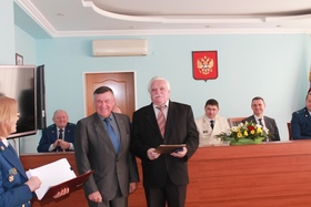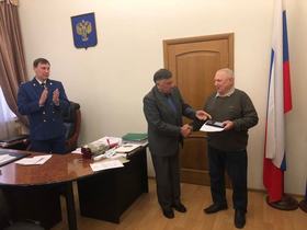 Затем председатель вручил ветерану Агаглуеву Сергею Дзероновичу награду Генерального прокурора РФ. Награды еще двум ветеранам, не сумевшим прибыть на собрание по состоянию здоровья, будут вручены позже.