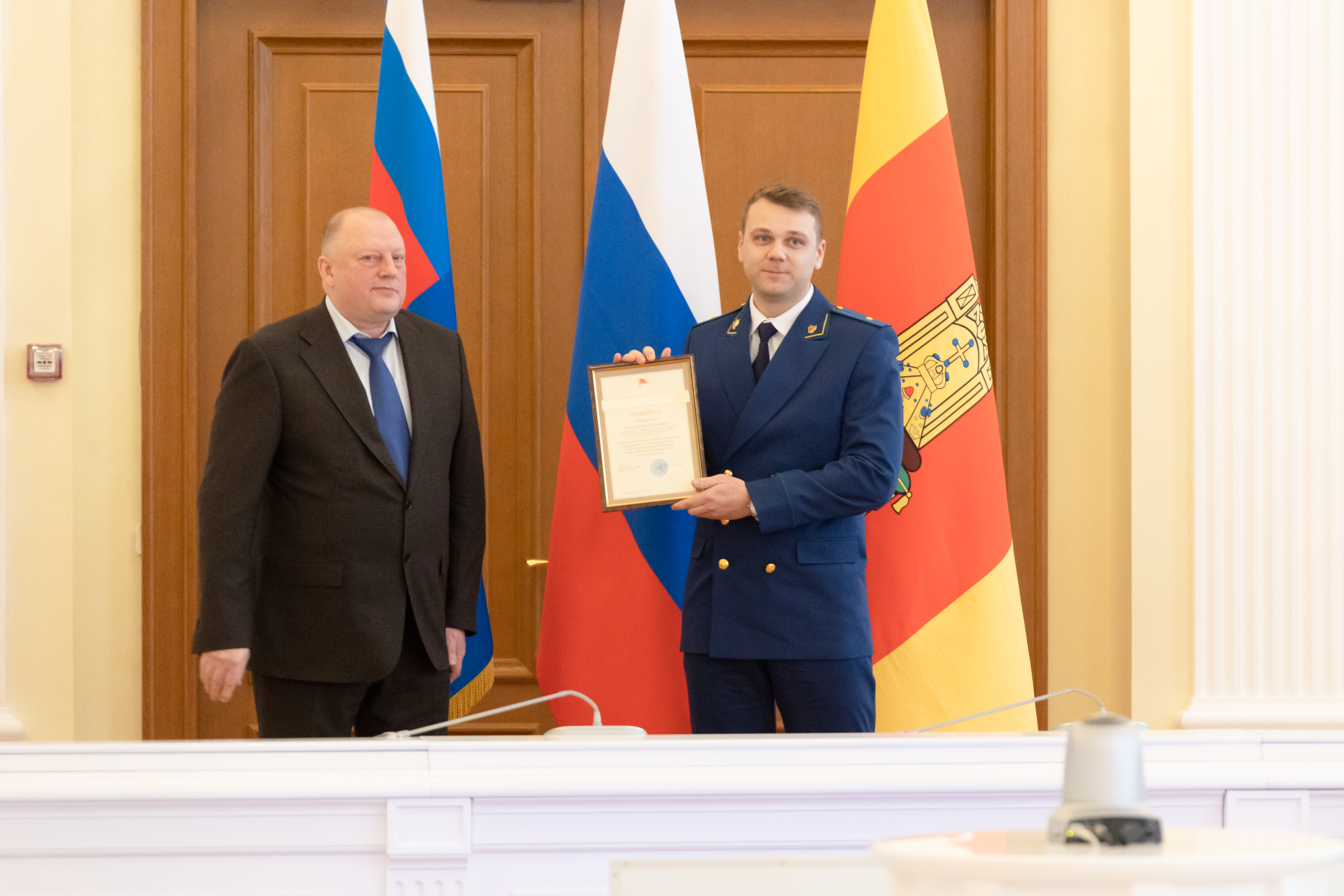Почетными грамотами и благодарностями отметили труд прокурорских работников временно исполняющий обязанности Губернатора Тверской области Виталий Королев, председатель Законодательного собрания области Сергей Голубев, Главный федеральный инспектор Тверской области Сергей Свитин, а также депутат Государственной Думы Федерального Собрания Российской Федерации Сергей Веремеенко.