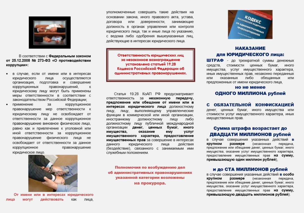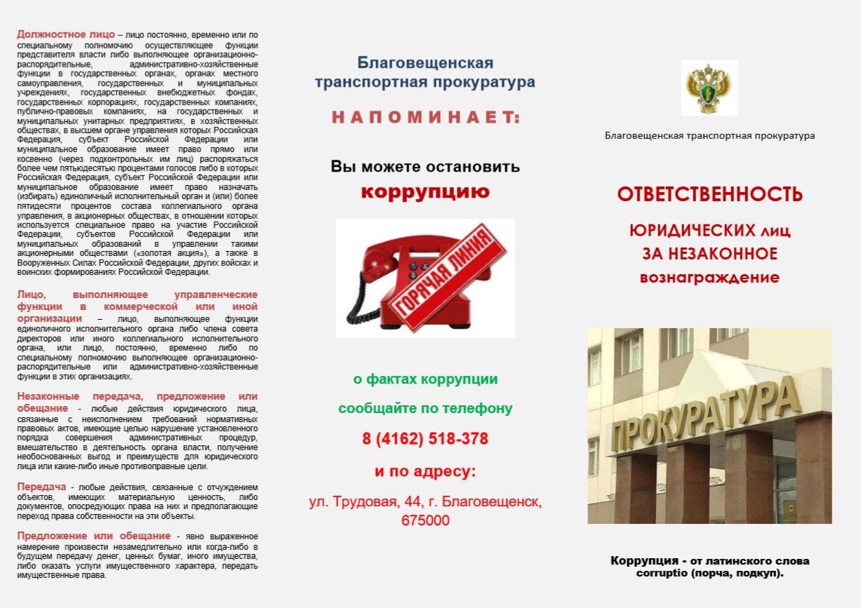 Памятка Благовещенской транспортной прокуратуры об ответственности юридических лиц за незаконное вознаграждение