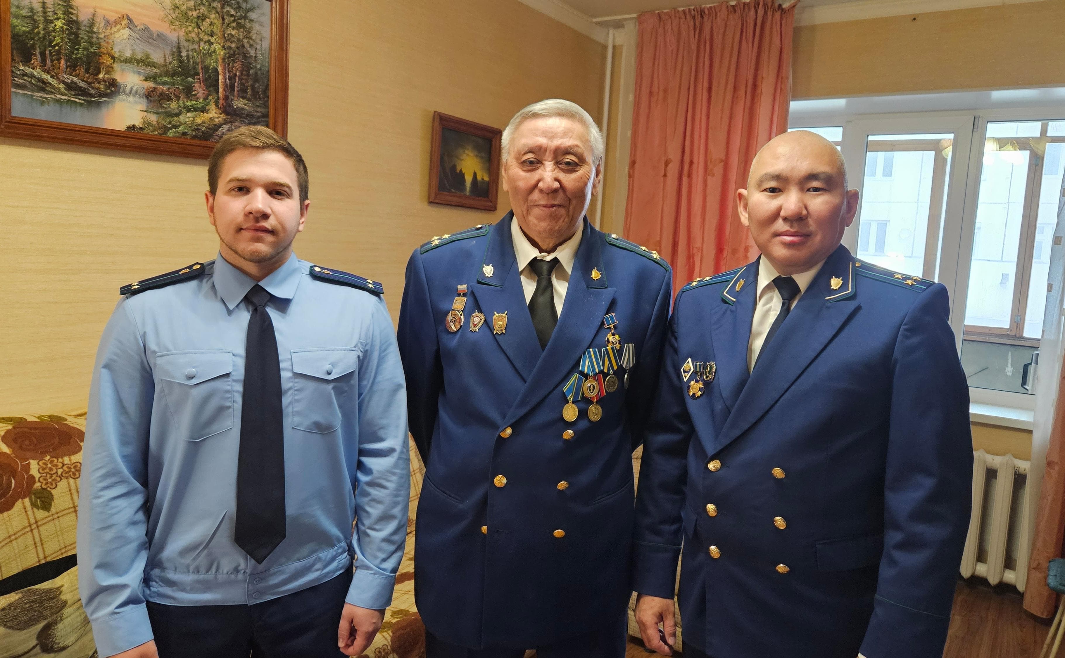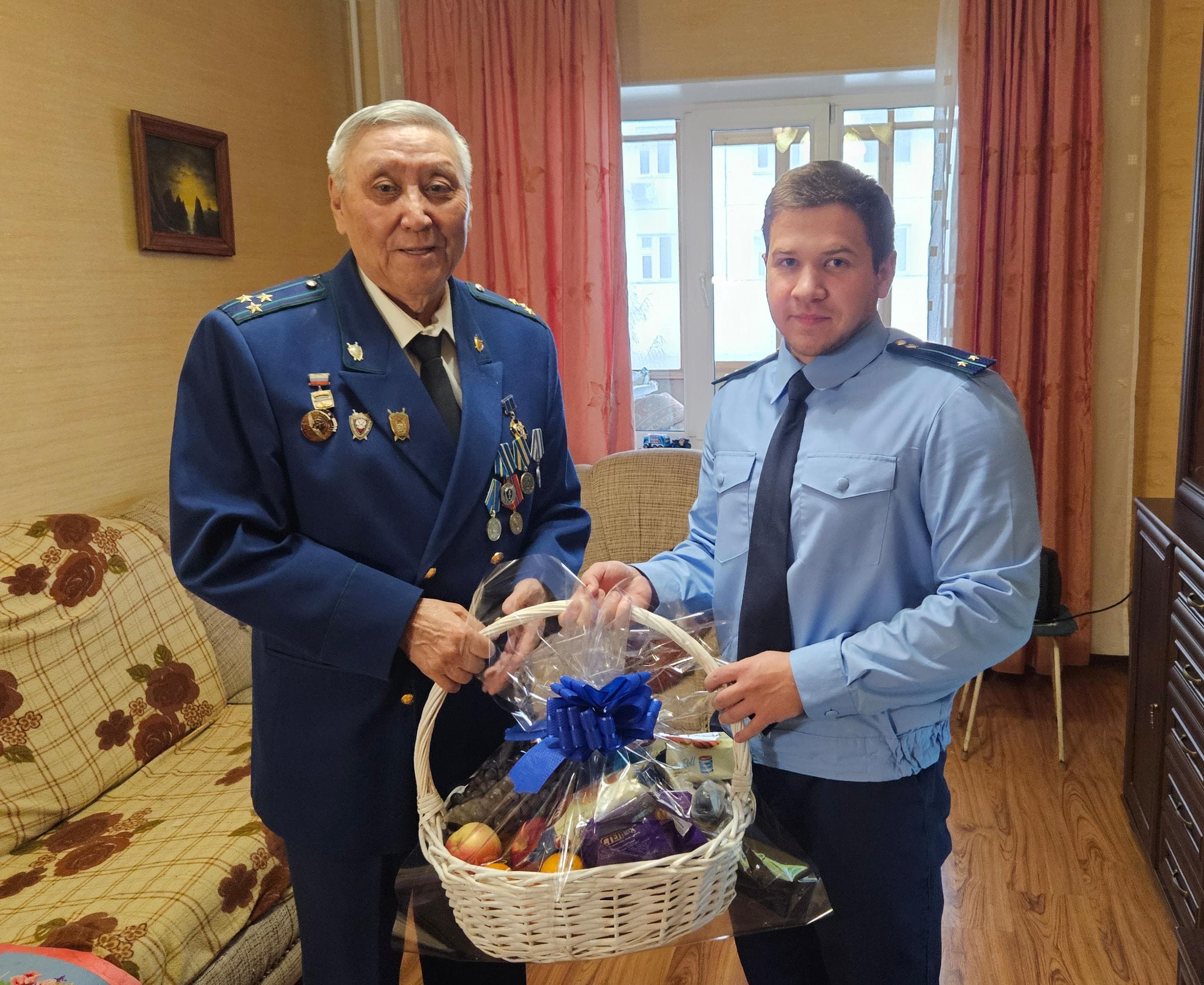 Якутский транспортный прокурор Артем Ильин и помощник Якутского транспортного прокурора Егор Мельянцев, являющийся молодым специалистом, в честь 45-летия со дня образования Восточно-Сибирской транспортной прокуратуры поздравили ветерана прокуратуры, Почетного работника прокуратуры Российской Федерации, почетного работника авиации Республики Саха (Якутия) Федорова К.М.