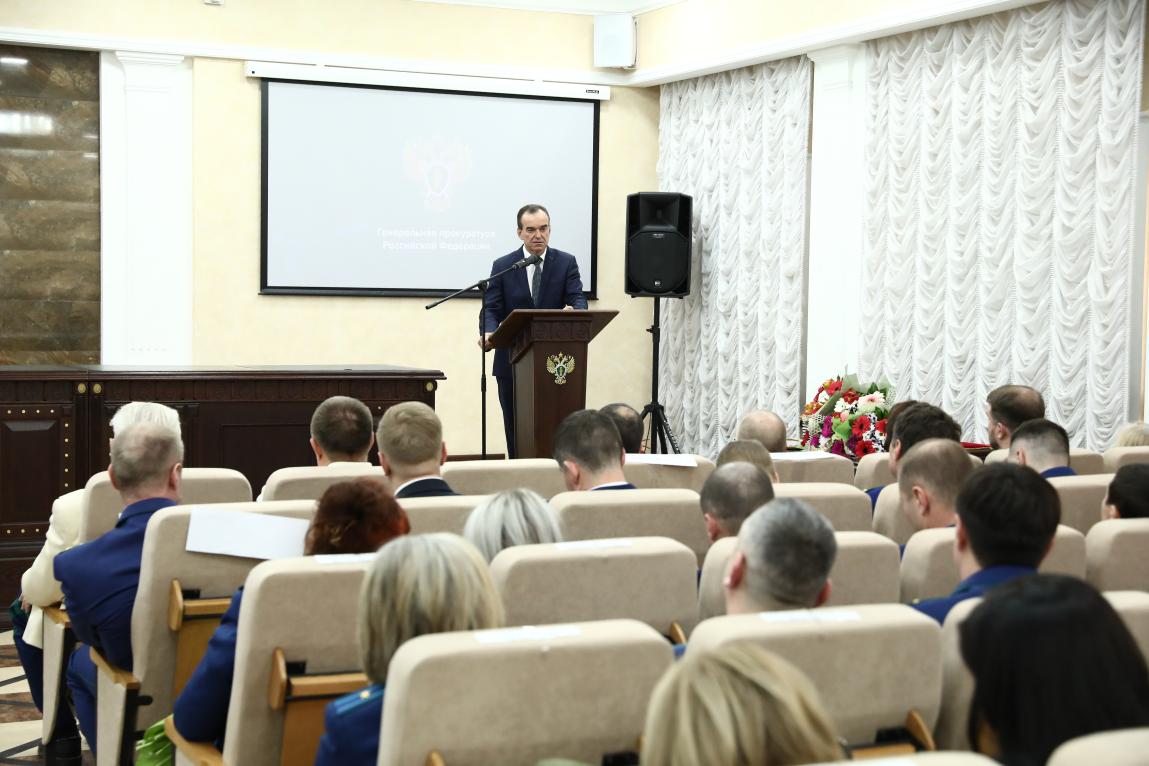 Губернатор Краснодарского края Вениамин Кондратьев поздравил работников органов прокуратуры края, подчеркнул важность взаимодействия администрации края и прокуратуры, поблагодарил за обеспечение социальной и экономической стабильности в крае. За многолетний добросовестный труд, профессиональное мастерство, существенный вклад в укрепление законности и правопорядка в крае и в связи с празднованием Дня работника прокуратуры Российской Федерации Губернатор вручил работникам и ветеранам прокуратуры края почетные грамоты администрации Краснодарского края ценные подарки и объявил благодарности.