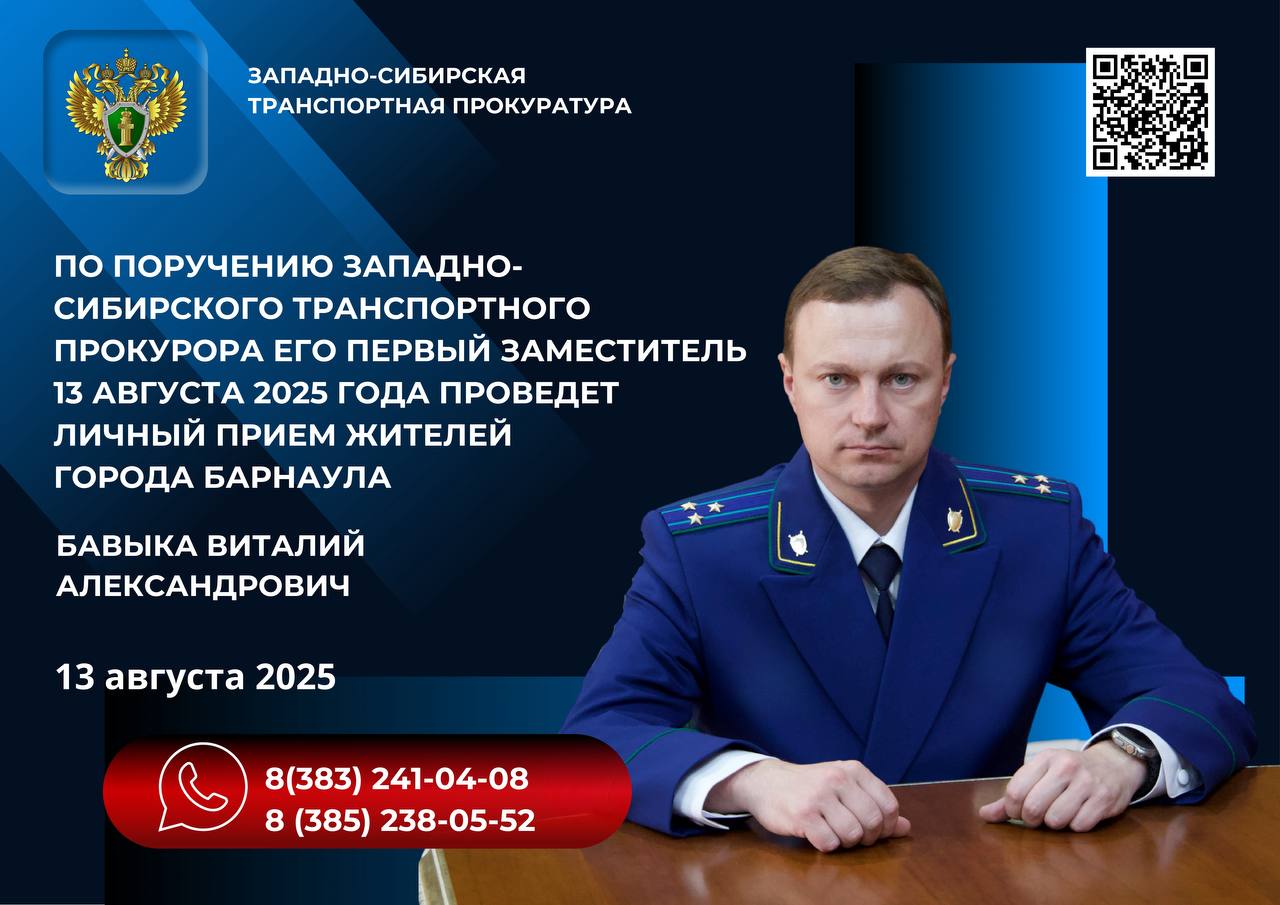 Первый заместитель Западно-Сибирского транспортного прокурора Виталий Александрович Бавыка проведет личный прием жителей города Барнаула 13.08.2025 с 12 ч. 00 мин. до 13 ч. 00 мин. в помещении Барнаульской транспортной прокуратуры по адресу: г. Барнаул, ул. Молодежная, д. 26.