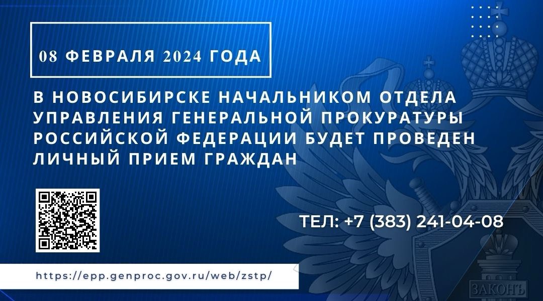В Новосибирске 08 февраля 2024 года начальником отдела управления Генеральной прокуратуры Российской Федерации будет проведен личный прием граждан