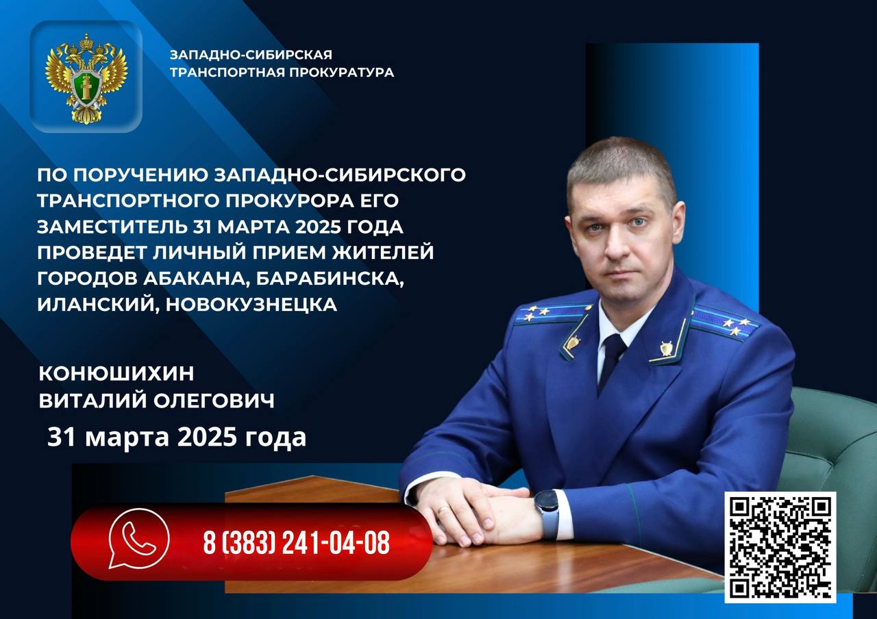 По поручению Западно-Сибирского транспортного прокурора его заместитель 31 марта 2025 года проведет личный прием жителей городов Абакана, Барабинска, Иланский, Новокузнецка