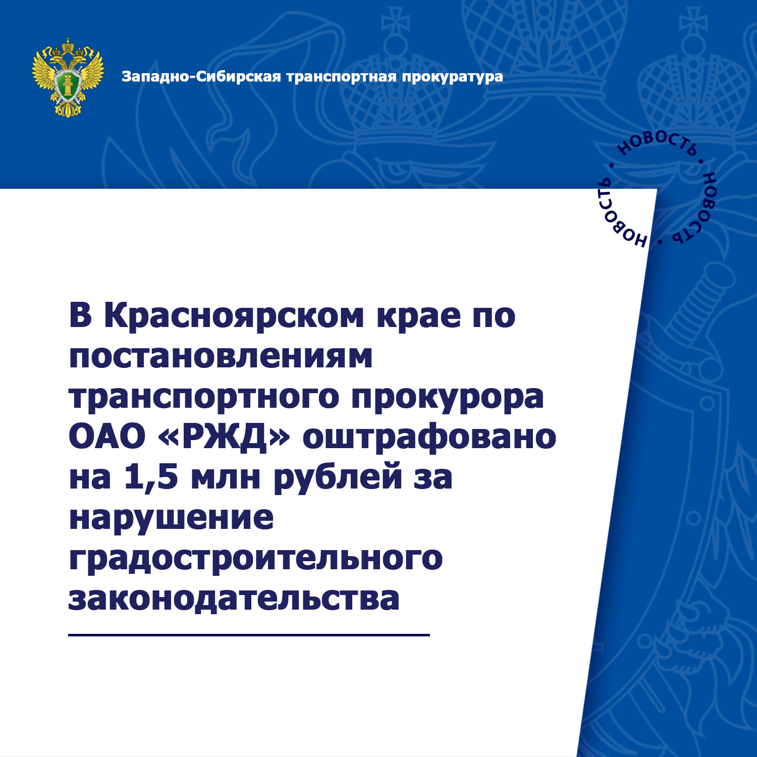 В Красноярском крае по постановлениям транспортного прокурора ОАО «РЖД» оштрафовано на 1,5 млн рублей за нарушение градостроительного законодательства