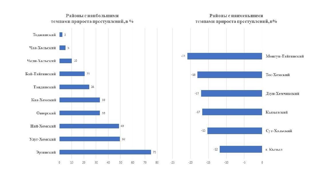 Рост установлен в десяти районах республики: Эрзинском (+75 %, с 8 до 14), Улуг-Хемском (+50 %, с 103 до 154), Пий-Хемском (+49 %, с 39 до 58), Овюрском (+33 %, с 12 до 16), Каа-Хемском (+33 %, с 39 до 52), Тандинском (+24 %, с 37 до 46), Бай-Тайгинском (+21 %, с 29 до 35), Чеди-Хольском (+10 %, с 20 до 22), Чаа-Хольском (+5 %, с 20 до 21), Тоджинском (+2 %, с 41 до 42) районах.