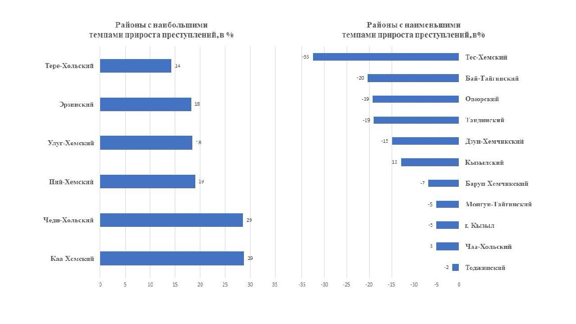 На фоне общего снижения преступности рост установлен в шести районах республики: Каа-Хемском (+28,8 %, с 73 до 94), Чеди-Хольском (+28,6 %, с 28 до 36), Пий-Хемском (+19 %, с 79 до 94), Улуг-Хемском (+18,4 %, с 201 до 238), Эрзинском (+18,2 %, с 22 до 26) районах.