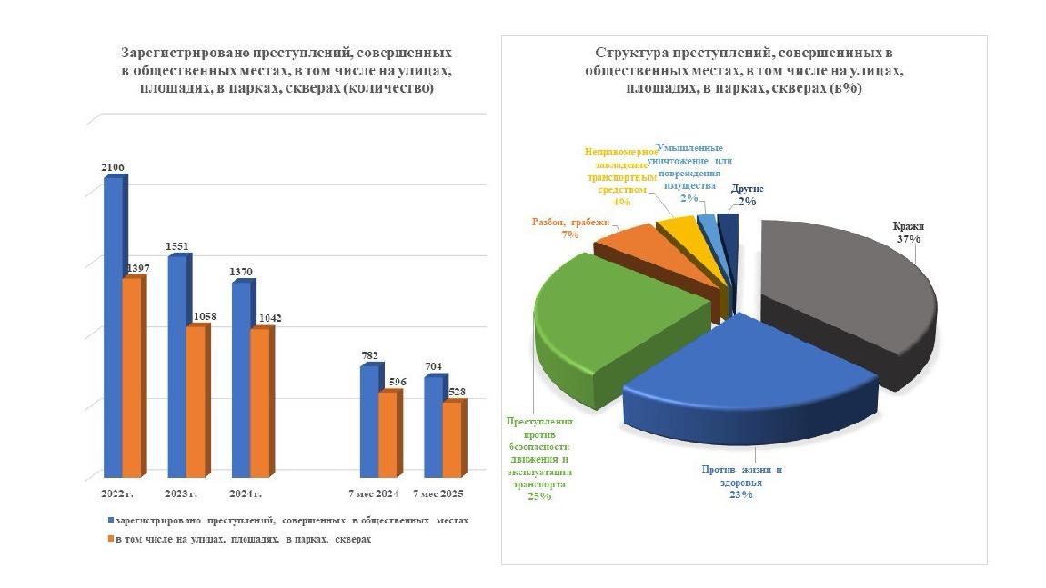 С 782 до 704 (-10 %) снизилось количество поставленных на учет преступлений, совершенных в общественных местах, в том числе с 596 до 528 (-11,4 %) совершенных на улицах, площадях, в парках, скверах.