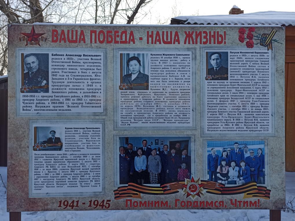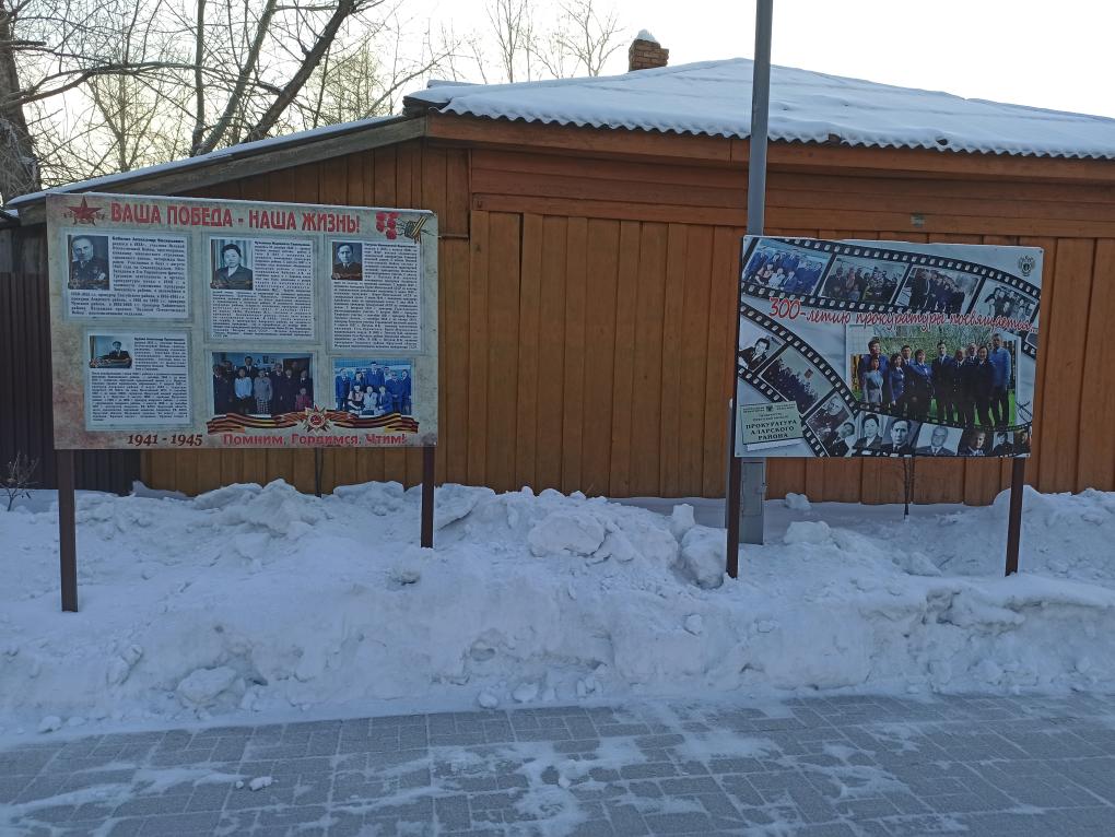 С целью преемственности поколений на прилегающей территории коллективом прокуратуры района организовано размещение 2-х тематических стендов, посвященных коллегам из числа ветеранов, а также действующим сотрудникам прокуратуры района. Размещение стендов в знак памяти, уважения и признательности последующих поколений позволит на долгие годы сохранить память о наших коллегах, которые самоотверженно исполняли свои трудовые обязанности во благо укрепления правопорядка и законности на территории района.