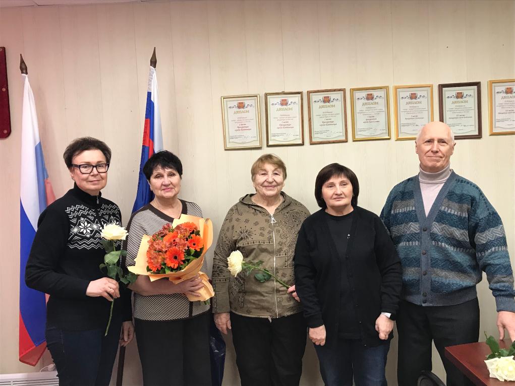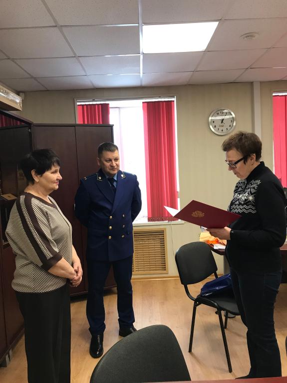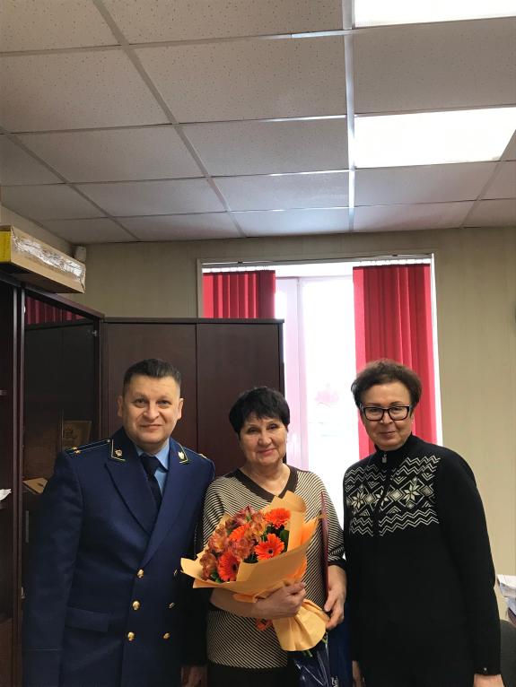 Председатель Совета ветеранов Васильченко О.И поздравила с 75-летием бывшего помощника прокурора г. Кандалакши Мазурмович Т.М. Ей были вручены поздравительный адрес, подарок и цветы.