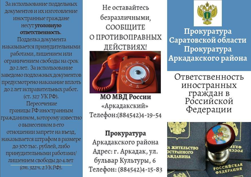 Прокуратурой Аркадакского района разработана памятка «Ответственность иностранных граждан в Российской Федерации»