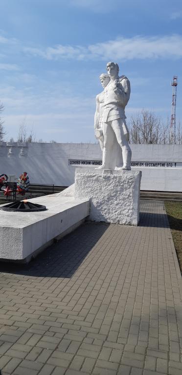 Надгробие братской могилы выполнено в виде скульптурной группы «Советские воины» высотой 3,5 м. Скульптура представляет собой фигуры 2 воинов с обнаженными головами. На переднем плане-солдат, держащий в правой руке, гранату. За ним находится фигура красноармейца с автоматом в правой руке, который опирается левой рукой на своего товарища. Фигуры установлены на многогранном подиуме.