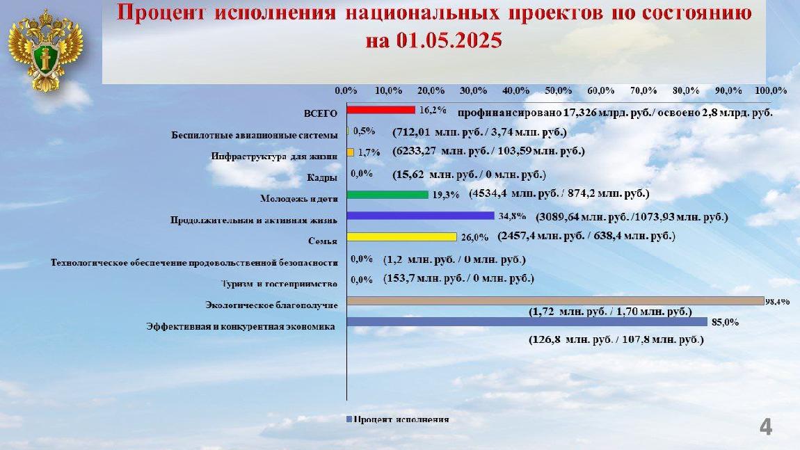 Отмечено, что процент исполнения национальных проектов в регионе по состоянию на 01.05.2025 составляет 16,2 %.