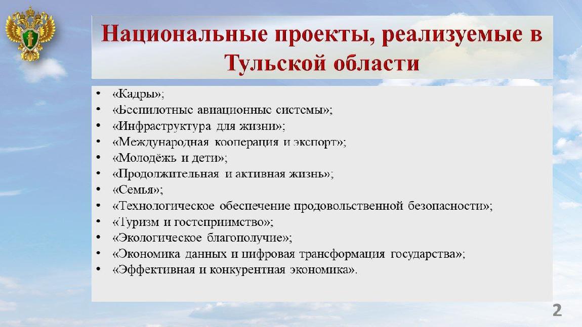 Уполномоченным органам власти поручено принять дополнительные меры по обеспечению контроля за своевременной реализацией мероприятий в рамках национальных проектов «Продолжительная и активная жизнь», «Семья», «Молодежь и дети», в связи с чем министру здравоохранения Тульской области объявлено предостережение.