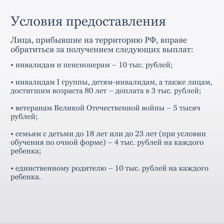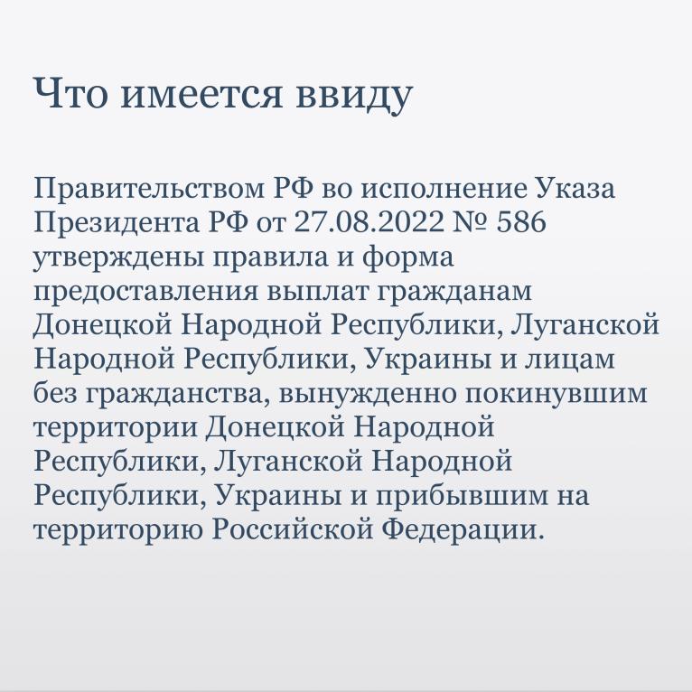Правительством РФ во исполнение Указа Президента РФ от 27.08.2022 № 586 утверждены правила и форма предоставления выплат гражданам Донецкой Народной Республики, Луганской Народной Республики, Украины и лицам без гражданства, вынужденно покинувшим территории Донецкой Народной Республики, Луганской Народной Республики, Украины и прибывшим на территорию Российской Федерации.