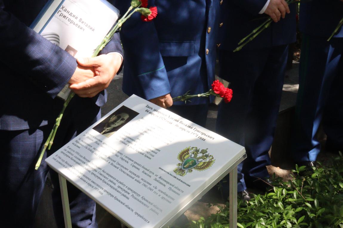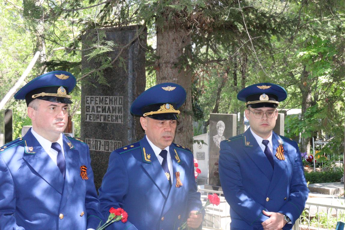 Прокурор Крыма Олег Камшилов, работники прокуратуры республики, ветераны надзорного ведомства совместно с преподавателями и студентами Крымского юридического института Университета прокуратуры Российской Федерации посетили захоронение участника Великой Отечественной войны – бывшего заместителя прокурора Крымской области Виталия Григорьевича Хандия.
